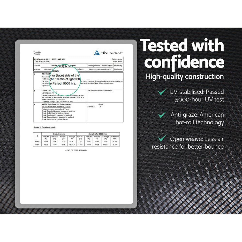 Bounce to your heart's content with our Trampoline. With its superior bounce characteristics featuring 64-piece triple rate springs, the 10-foot trampoline enables safe and durable bouncing with no worries. The heavy-gauge steel framework is designed to handle all robust play and is UV-tested for quality and reliability. Other great features include 8 posts for strong support, 20mm thick padding, anti-graze mat, safety netting and a double-lock zip-and-clip entry. So jump to it and order our trampoline today.