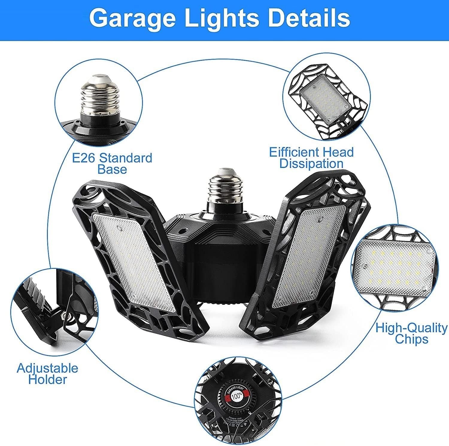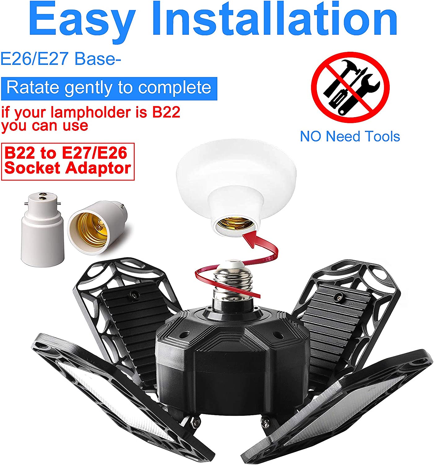 - Easy Installation: No tool needed for installation, our LED adjustable garage light can use any E26/E27. The only thing you should do is screwing it in when you install the light. It is easy to install, everyone could install the light easily. Please make sure the switch is turned off before installation!