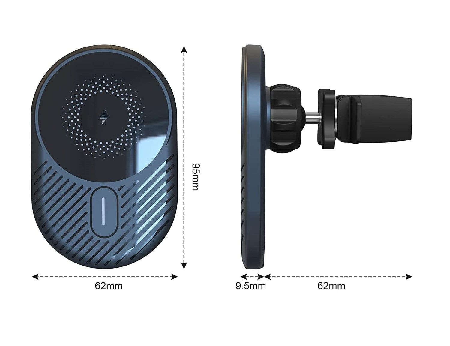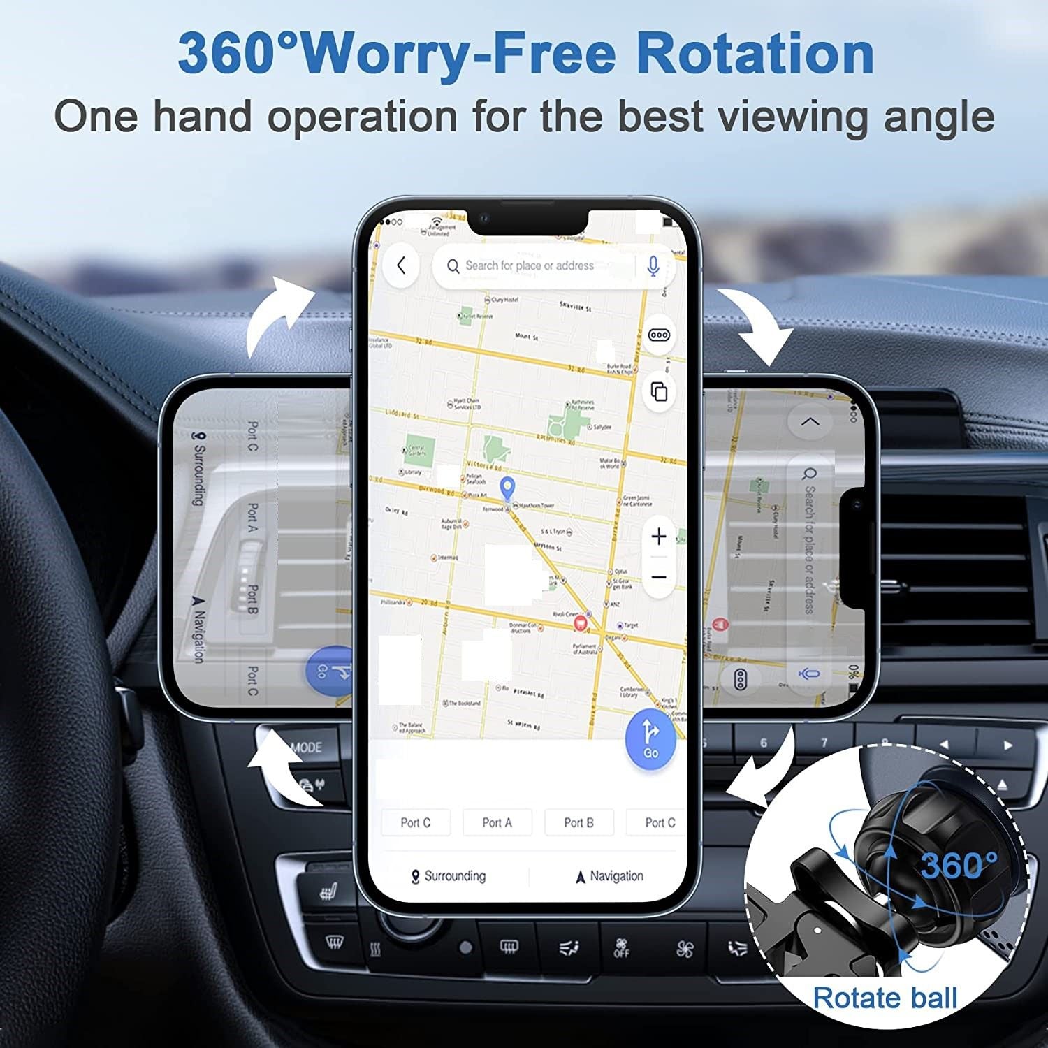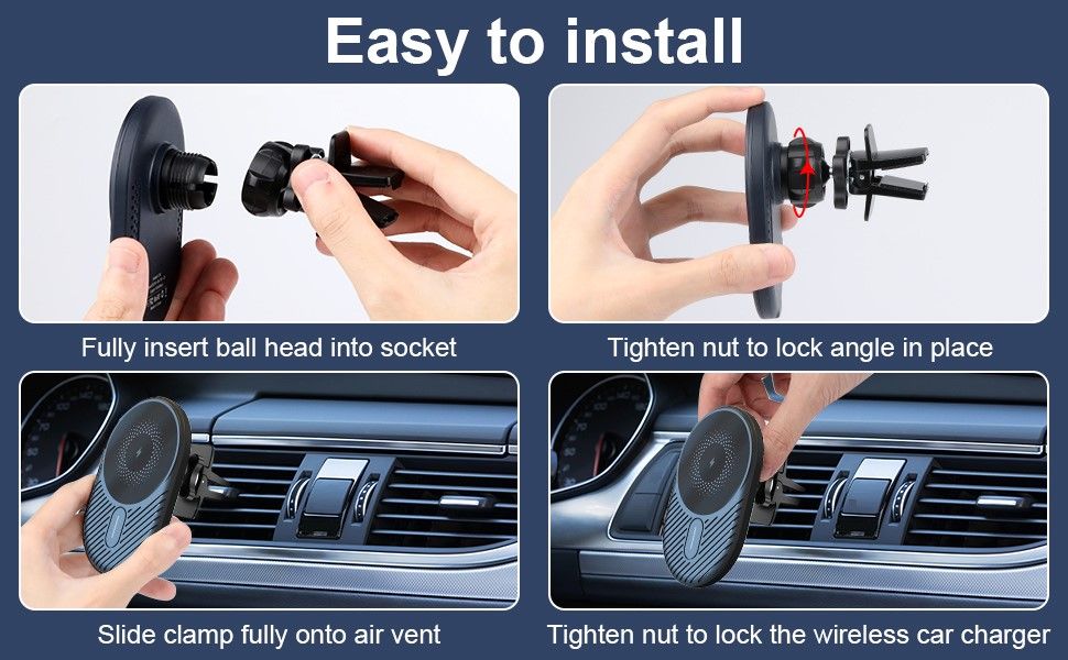 - Stable and secure air vent mount and 360° Adjustable Rotation: Magnetic wireless car charger mount uses a high-quality universal ball rotating connection, which can 360-degree rotation. With just a simple turn of the phone, you can view your GPS app in portrait or landscape. The clamping is stable and does not fall. The base of the mount remains attached to your car's air vent and does not move regardless of how much swiveling or rotating you do.