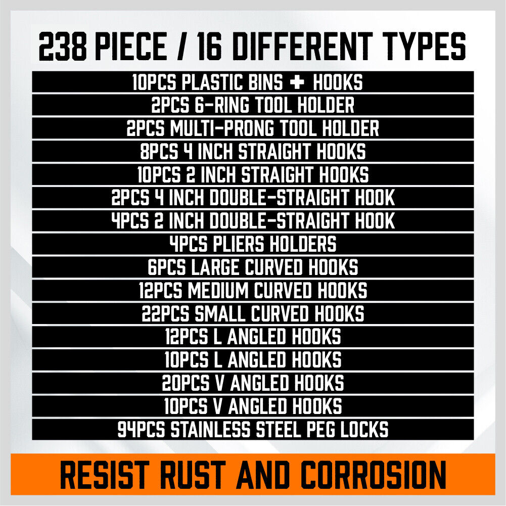 238Pc Pegboard Hooks Set Peg board Bins Parts Storage Assortment Tools Organiser