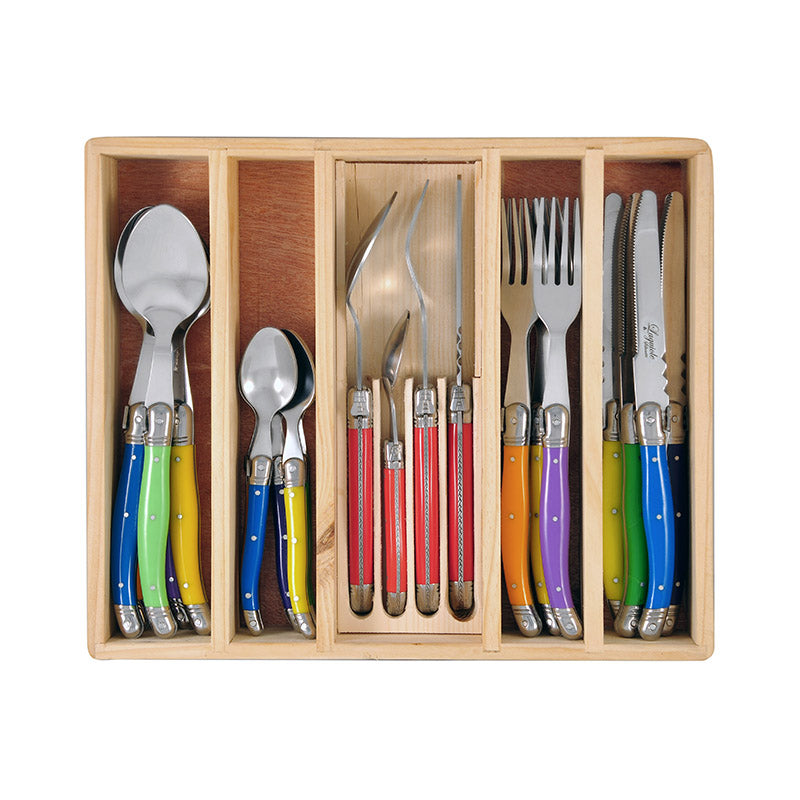 Laguiole Silhouette 24 piece Multi Colour Cutlery Set is a premium range epitomising quality and elegance. Presented in the pine wood traditional presentation boxing it is a great gift or personal purchase to finish a table setting in the most alluring way.This sought after design originated in the town of Laguiole in Southern France and is now a generic term for all cutlery manufactured according to this design.