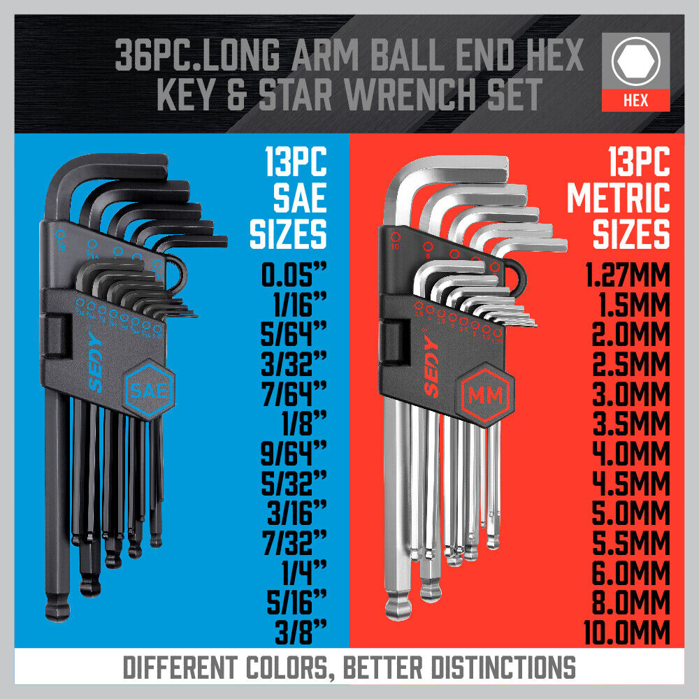 Introducing our 36-Piece Hex Key and Tamper Proof Torx Key Set, designed to meet all your fastening needs. Made from heat-treated S2 steel with a manganese phosphate finish, these keys are durable and built to last. The set includes both metric and imperial sizes, with chamfered ends for smooth insertion and reduced wear. The color-coded housing provides instant measurement identification, and the hinged case opens flat for easy access and visibility. The T-handle design allows for quick and efficient tightening or loosening of fasteners, while the ball hex ends enable a 25-degree entry angle for reaching around obstacles. The set also includes temper-proof Torx wrenches and a universal handle for added versatility. Conveniently arranged in a cloth bag, this set is suitable for various working environments.