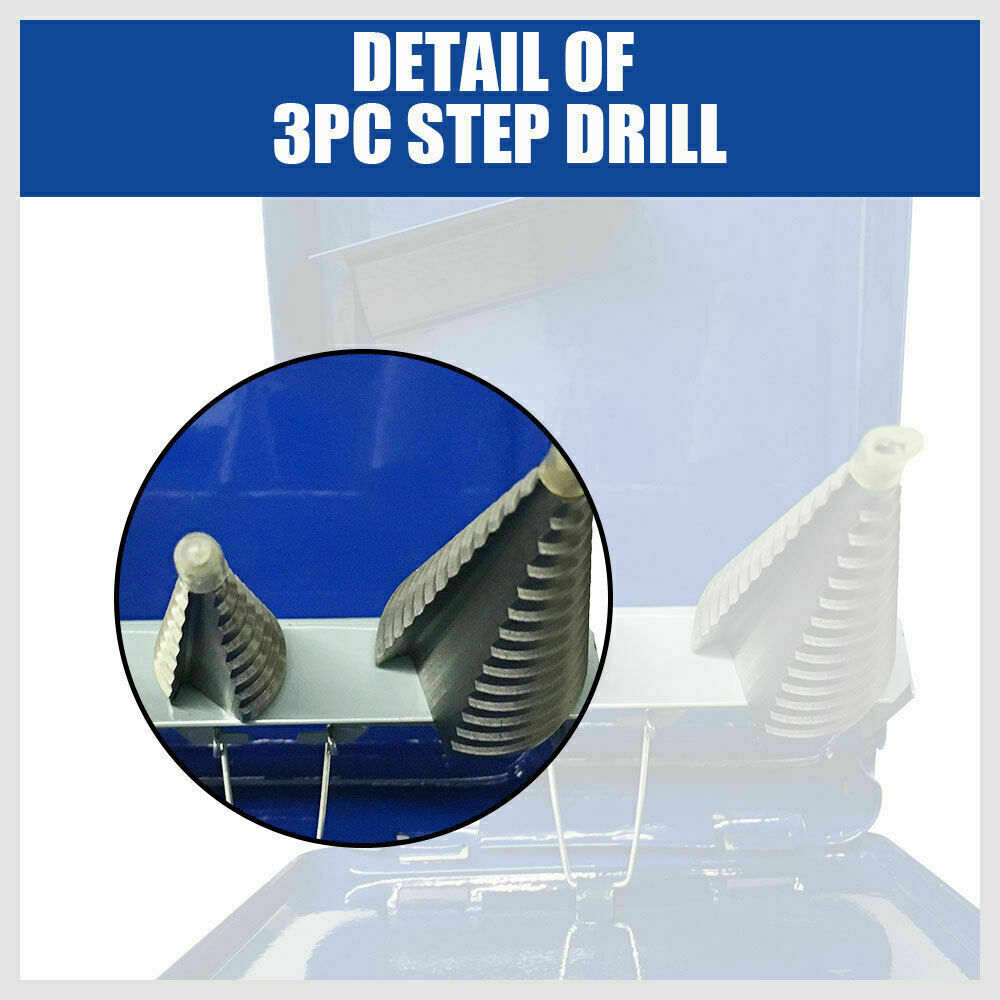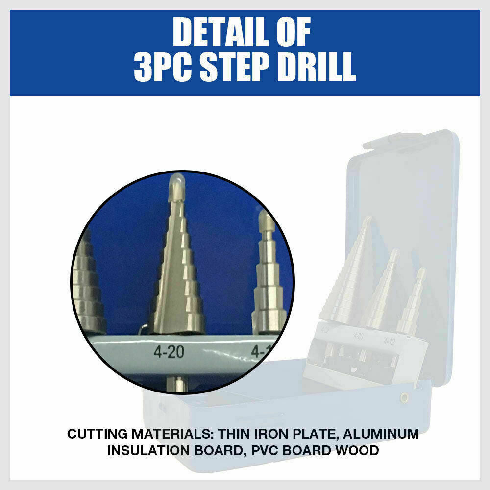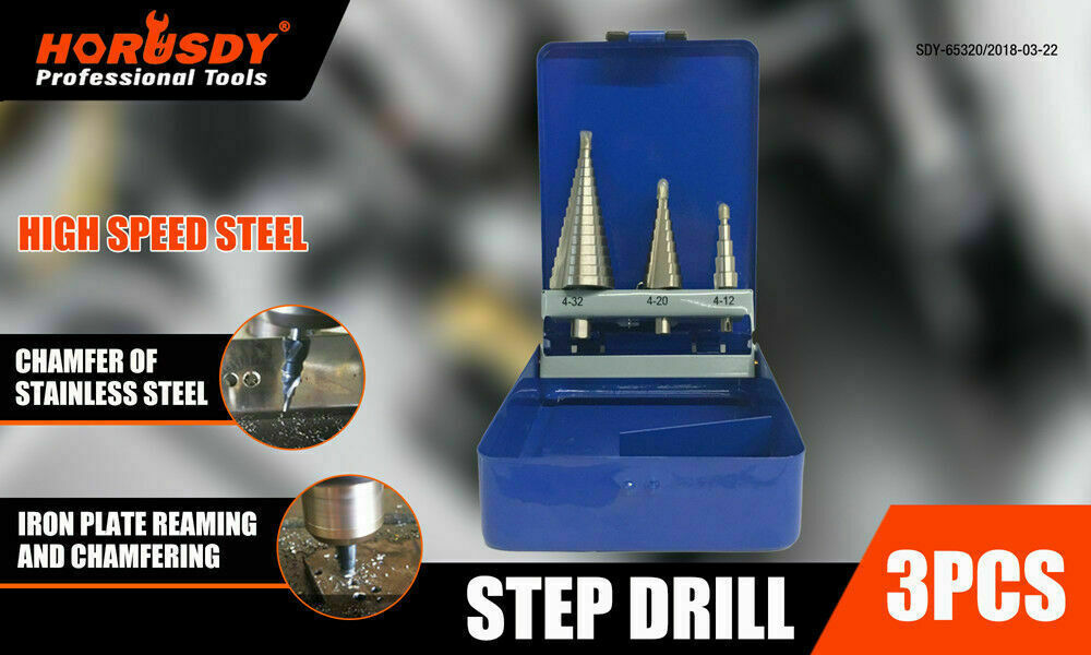 Reviews 3Pc Step Cone Drill HSS Steel Titanium Bits Set Hole Cutting + Case 4-12/20/32mm 0 out of 5 stars This product has no reviews yet Write a review Write a review