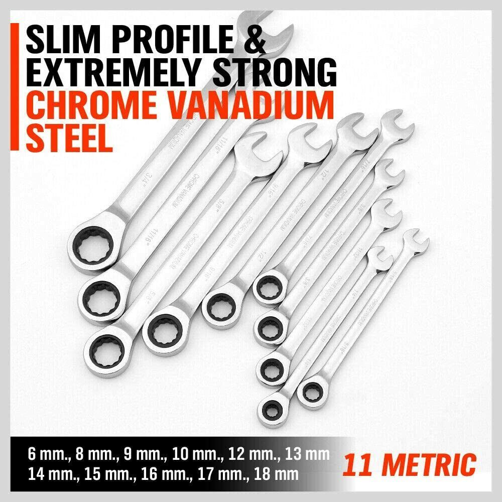 11 Metric: 6mm, 8mm, 9mm, 10mm, 12mm, 13mm, 14mm, 15mm, 16mm, 17mm, 18mm