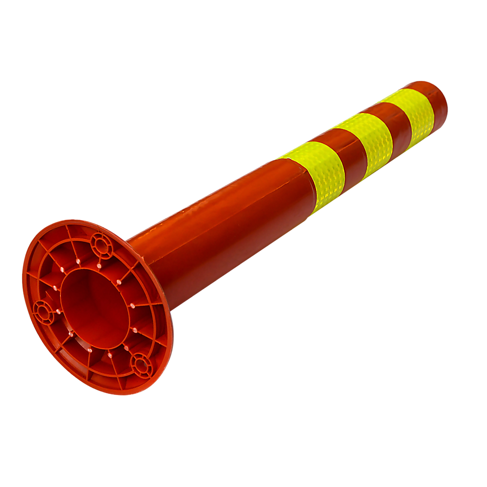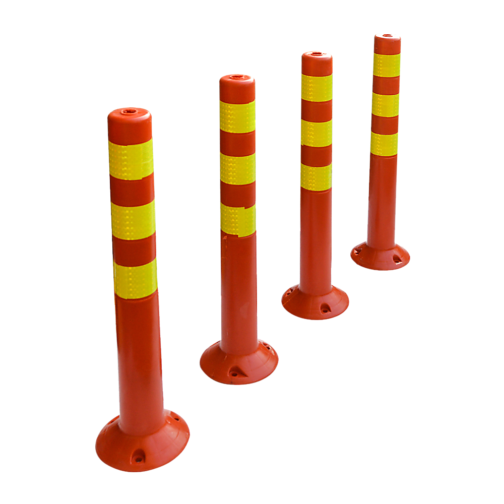 In fluorescent orange and yellow, this set of four plastic traffic bollards from Randy & Travis Machinery is perfect for traffic control, crowd control, or marking off spills, potholes, construction areas, or other hazards. Crafted from durable, yet forgiving plastic, these bollards can hold up under the thumps and bumps of a car park, yet not damage the vehicles that run into them.