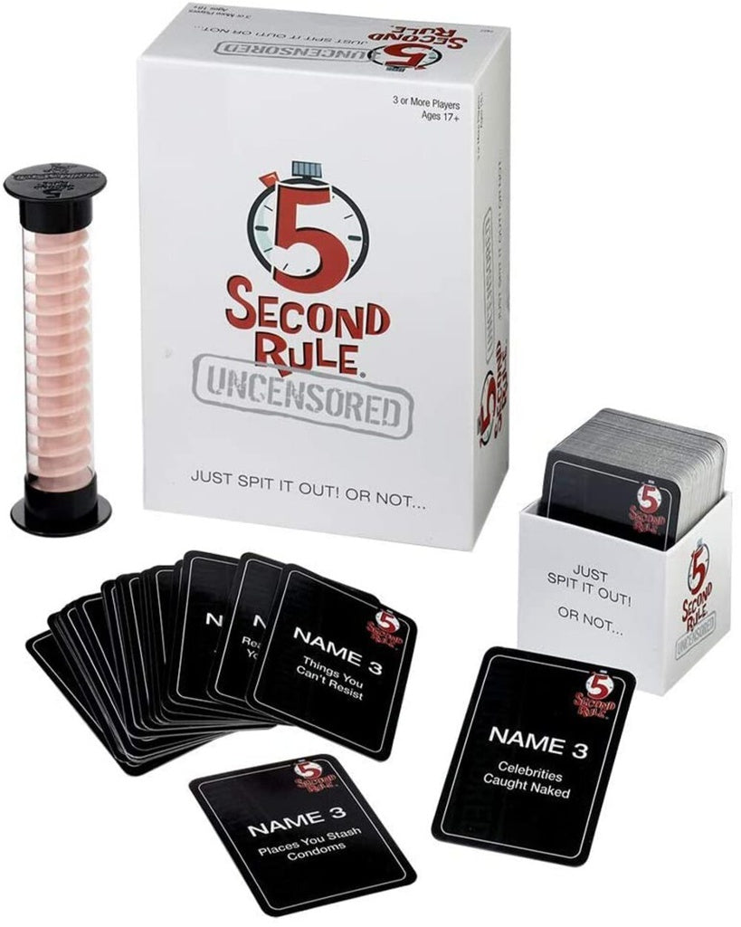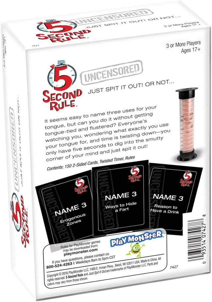 Maybe you've seen Ellen play the original game with the guests on her show, or maybe you've seen the funny videos. Well, since the original is so popular, we put on our 'uncensored hats' and cooked up this new adult version! Same game - name three things in five seconds - but the themes are a bit more risky or in touch with pop culture. So your answers may be more uncensored! And, yes, the game includes the famous silly zooop marble timer, just a little smaller for easy travel, and with a color makeover for a cool look! Get together with friends and let the good stuff (uncensored!) Times fly!