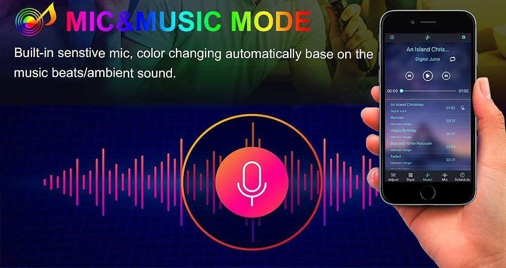 - Music sync led strip lights: the lights strip has smart music mode, sensitivity adjustable microphone, lights color will change with the the rhythm of the sound and music, which creating romance, relaxation, magical and interesting atmosphere for your party