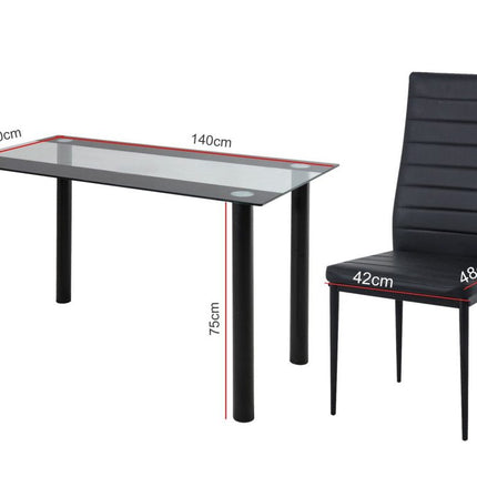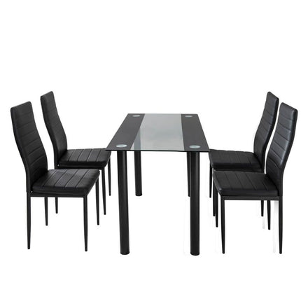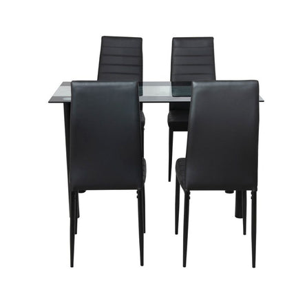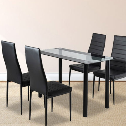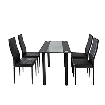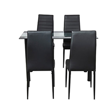 Distinctive in design and elegant in finish, our 5-piece Dining Set is a perfect centerpiece for your dining area. With its sleek lines and exceptional craftsmanship, the six chairs and single table will suit any décor that represents smart taste and discerning style.