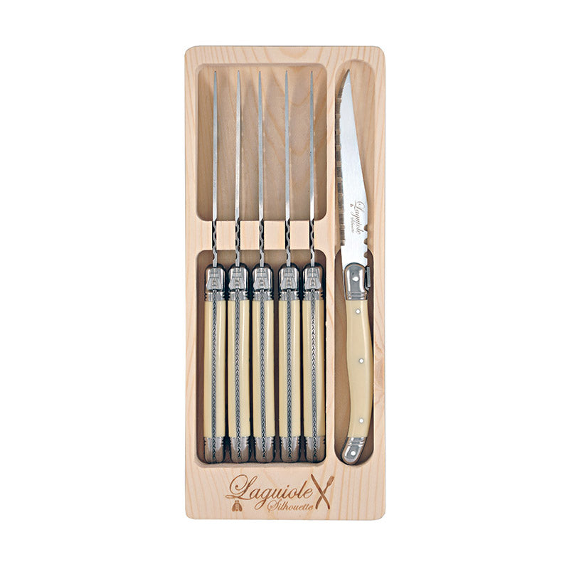 Laguiole Silhouette 6 piece Ivory Steak Knife Set is a premium range epitomising quality and elegance. Presented in the pine wood traditional presentation boxing it is a great gift or personal purchase to finish a table setting in the most alluring way.