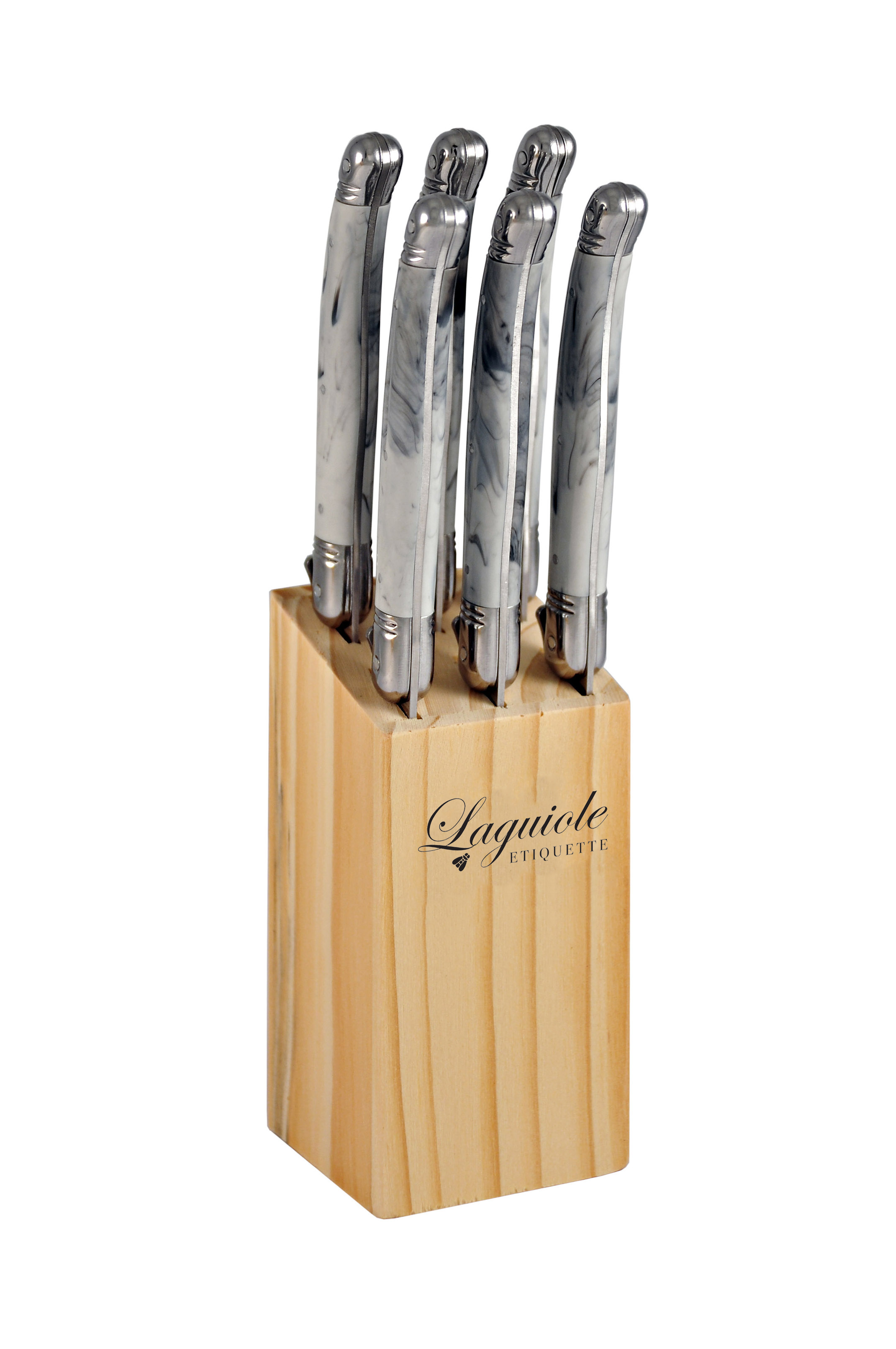 Forming part of the Laguiole Etiquette range is the 6-piece Marble White Steak knife set packaged in the Traditional pine block. Well serrated these sharp knives make cutting a steak easy and enhances the enjoyment. Ideal for indoor and outdoor use these will add to colour or elegance of your table setting.