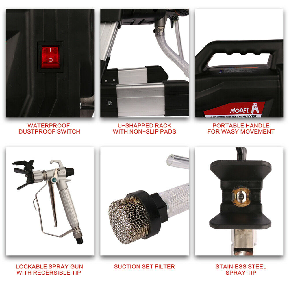 Stainless Steel Piston Pump Provide high pressure power to spray unthinned paints.Flexible Pressure Regulation Control paint flow on any project size,adjust the spray effects to what you expect. AIRLESS PAINT SPRAYER WITH 517 TIP Softer spray finish with greater control and less overspray.Flexible Suction Tube Spray directly from 1 or 5 gallon paint containers.