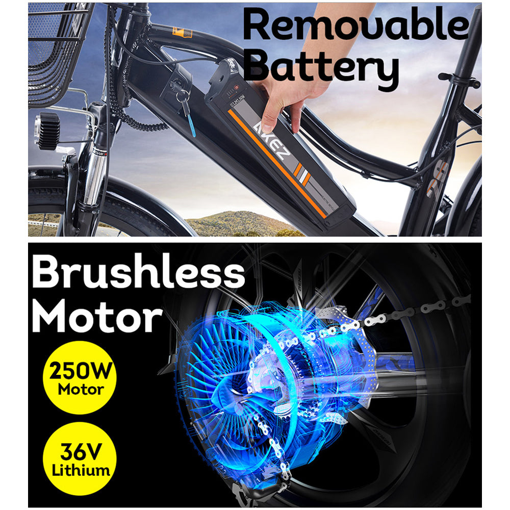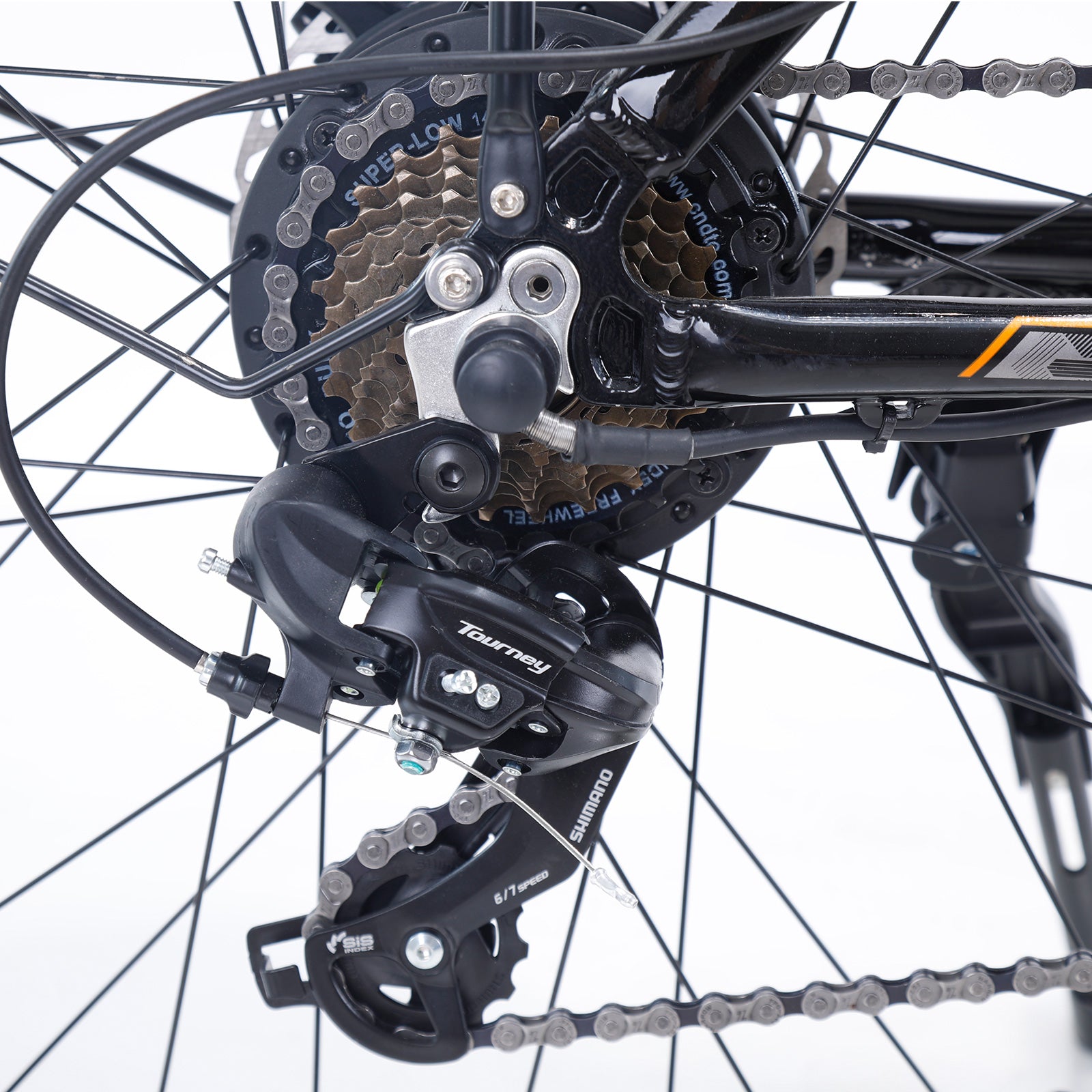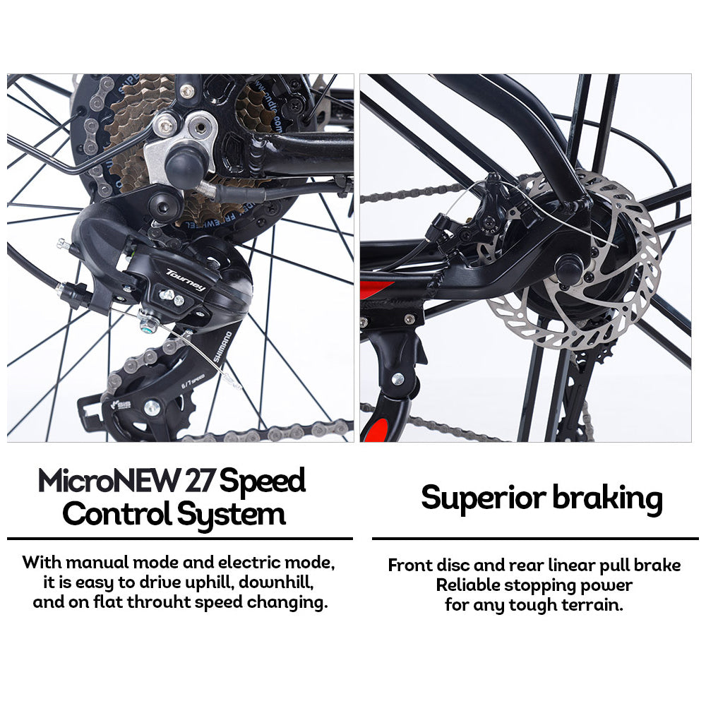Offering maximum versatility for a wide range of activities, this city/mountain bike lets you cruise, coast, and climb in comfort, whether making your daily commute or riding on rough roads. Adopting the most popular internal cable design, aluminum alloy frame and anti-rust powder coating, it is at the forefront of fashion. However, as a powerful and cost-effective mountain e-bike, it is equipped with a powerful 250W brushless gear motor. Very easy to ride, its speed up to 25km/h. The removable 36V 10Ah lithium battery only charge 6-8 hours and cruise for up to 35KM on a single charge.