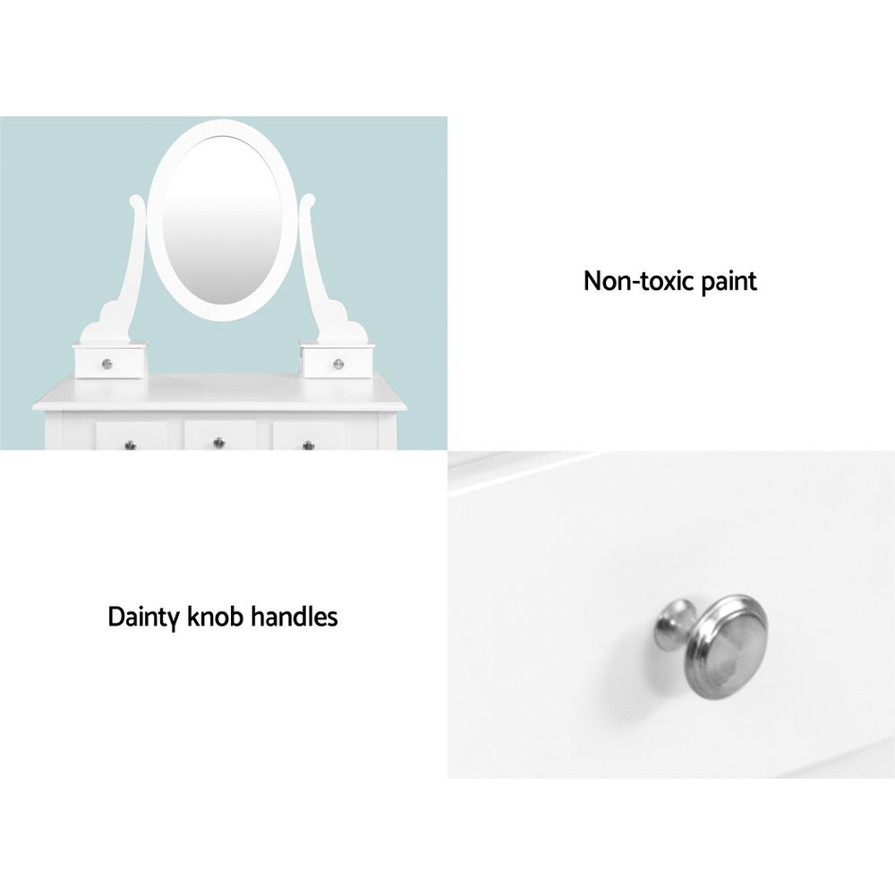 Add a touch of Provincial charm to your bedroom with our luxurious period style Artiss Dressing Table Set. Graceful and elegant, the set exudes finesse in every corner and aspect. Much like yourself as you prepare for the day in alluring beauty. Made with meticulous craftsmanship, the dressing table features elegant cabriole legs, large mirror and five drawers that provide ample storage space for your jewellery pieces and makeup essentials. It also features a compensated table design that allows more leg room for seating comfort. Plus, the mirror rotates 360° so that you can admire your reflection from any angle. The top frame with mirror and two drawers is removable for complete versatility so that you can use it as a mirrorless dressing table or console table. You can even replace the mirror with one in a different style for a change in decor. And the piece de resistance must be the beautifully embroidered padded stool that is no less a work of passionate furniture making. Together, the ensemble is immediately captivating to the senses.