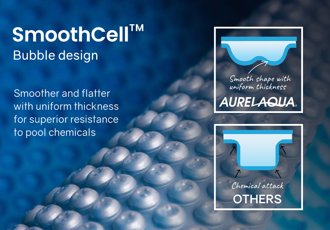 The exclusive Aurelaqua Solar Swimming Pool Cover features an exclusive bubble design with a smooth and flat shape without any sharp curves that are prone to being thin weak points. These thinner sections in other pool blankets are more susceptible to damage by pool chemicals and general wear and tear.