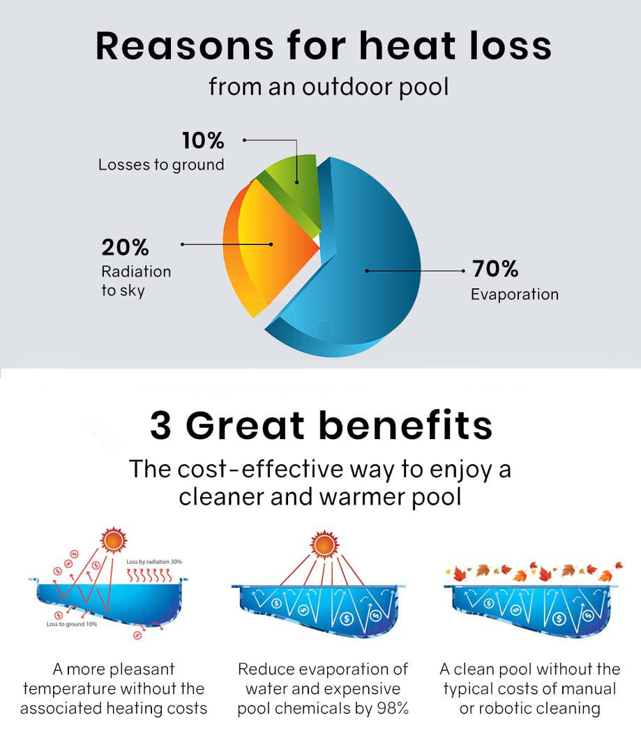 The Aurelaqua Solar Swimming Pool Cover also eliminates 98% of your pool's water evaporation and keeps expensive chemicals needed to maintain pool health from escaping through the surface.