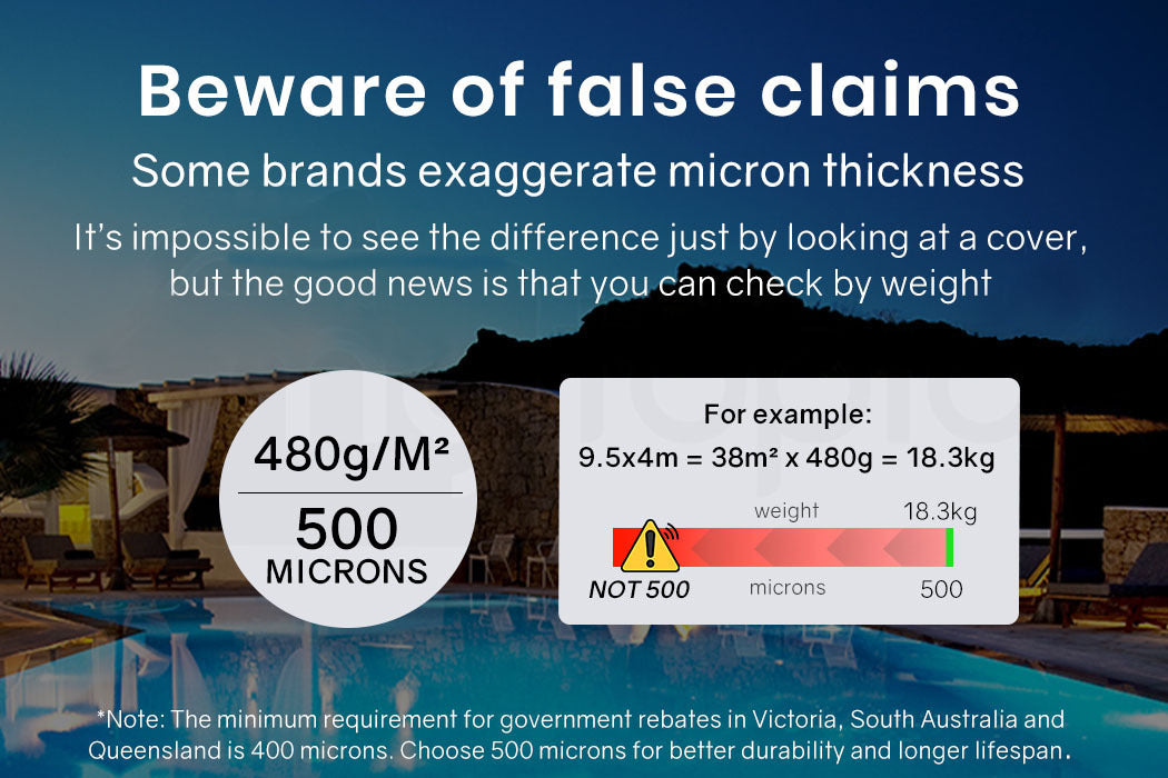 This premium blanket has ultimate durability because of its ability to withstand UV damage, chemical penetration and tearing. While other brands may claim to have a thickness of 500 Microns, we strongly recommend that you check that the weight of their product matches ours. If it doesn't weigh as much, or if they don't advertise the product weight, then you should be wary of their claim.