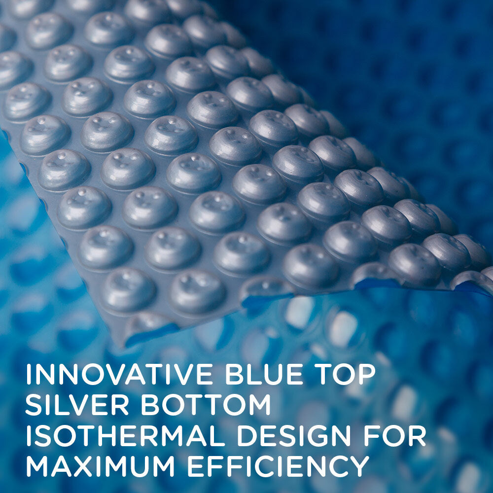 Swimming is a truly Australian pastime, and pools are such a fantastic amenity to your home. However, there are inconveniences with constantly maintaining a household pool. The Aurelaqua Solar Swimming Pool Cover greatly reduces these inconveniences by providing a host of beneficial care, maintenance and money saving functions. The innovative split blue and silver isothermal design fulfills unique benefits for your pool. While the sun is shining, the translucent blue rippled surface allows for greater heat to easily pass through, magnified by the bubbles to naturally heat the water. The silver underside then acts to trap the heat underneath and retain the pools warmth for longer periods of time, which means swimming seasons extend further into the year. This isothermal effect also inhibits the negative effects of photosynthesis such as the proliferation of algae.