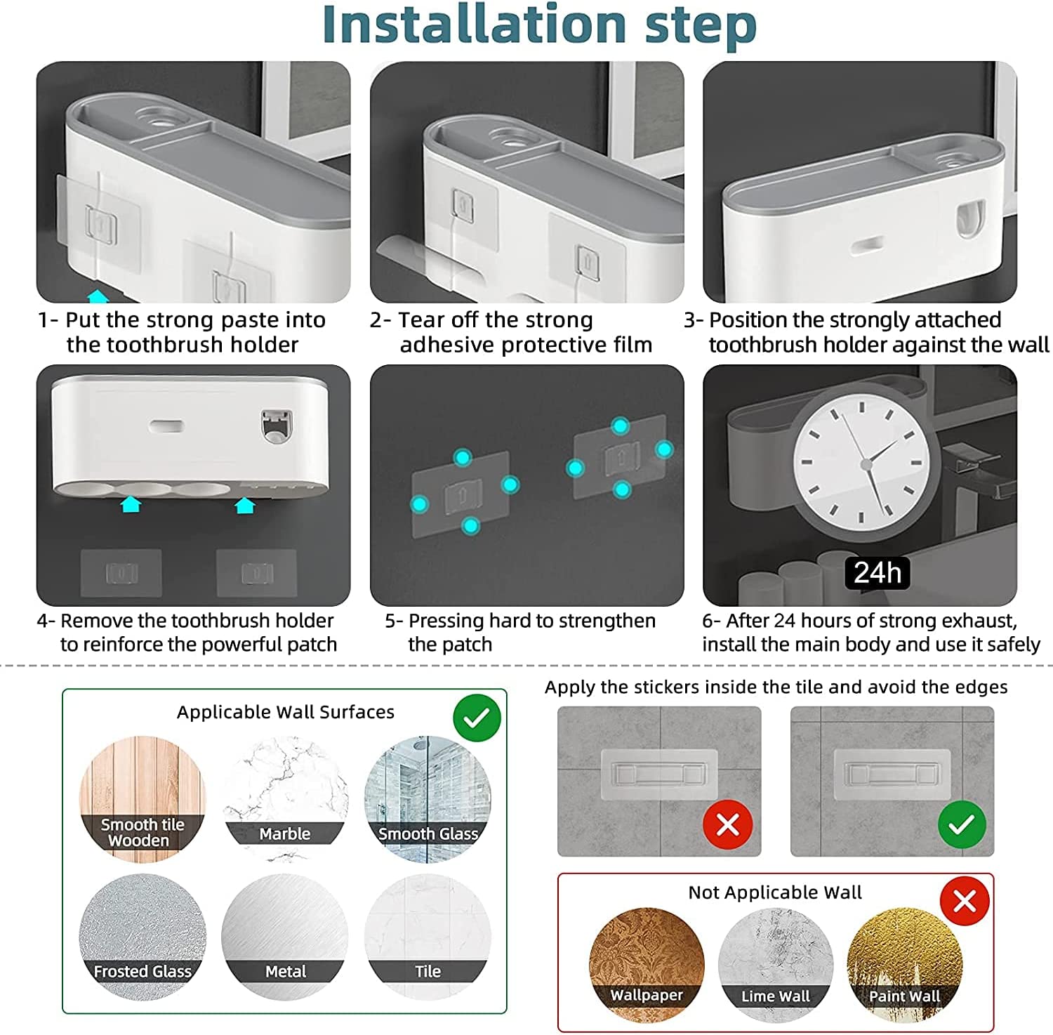 - No Need To Punch: The tooth brush holder is attached with strong seamless stickers. Strong adhesive, toothbrush holder wall mounted. Easy to install, no drilling and no tools, fixed well, will not fall off and break the wall.. Please note that this sticker is only applicable to surfaces such as smooth tile, wooden wall, smooth marble, smooth glass, frosted glass, smooth metal.