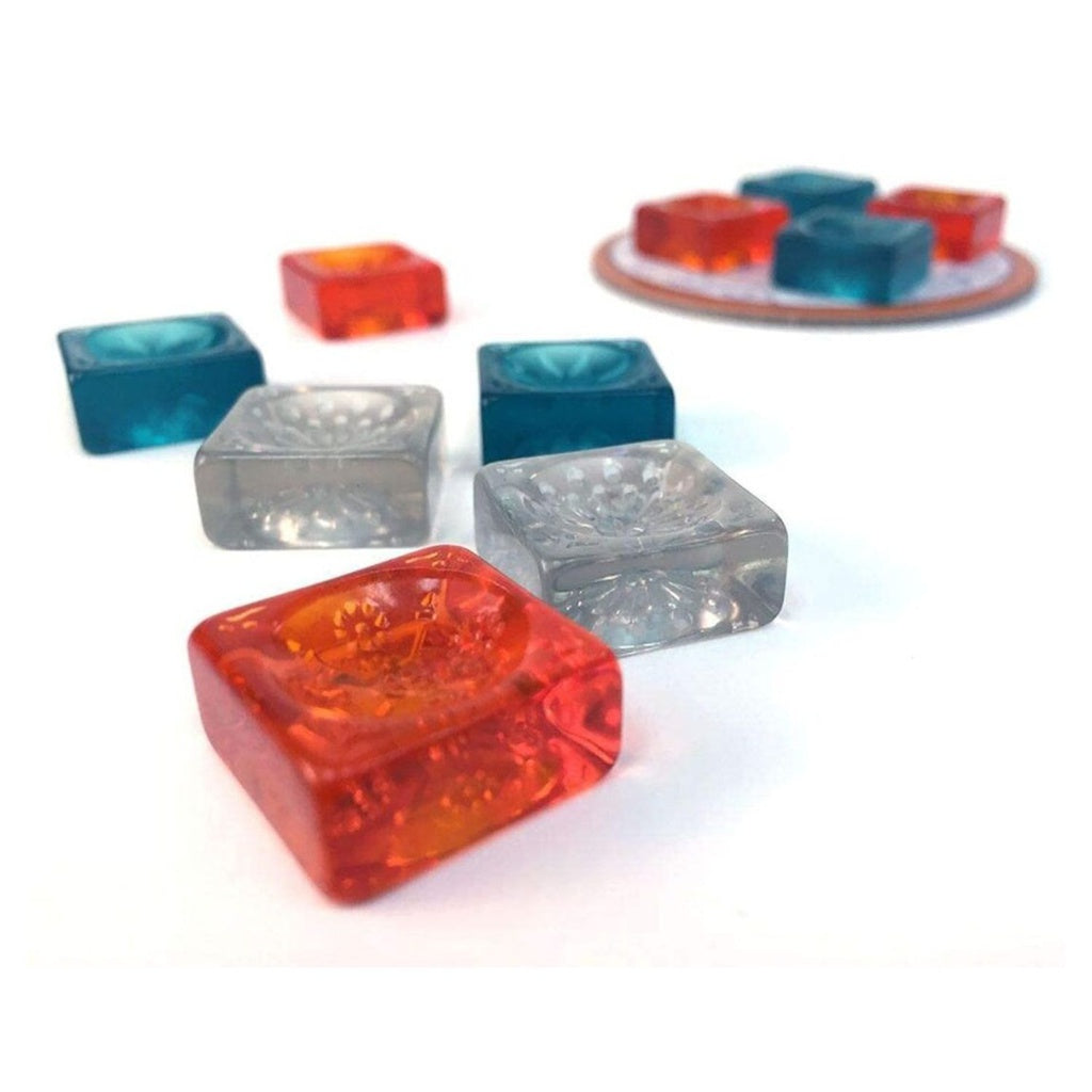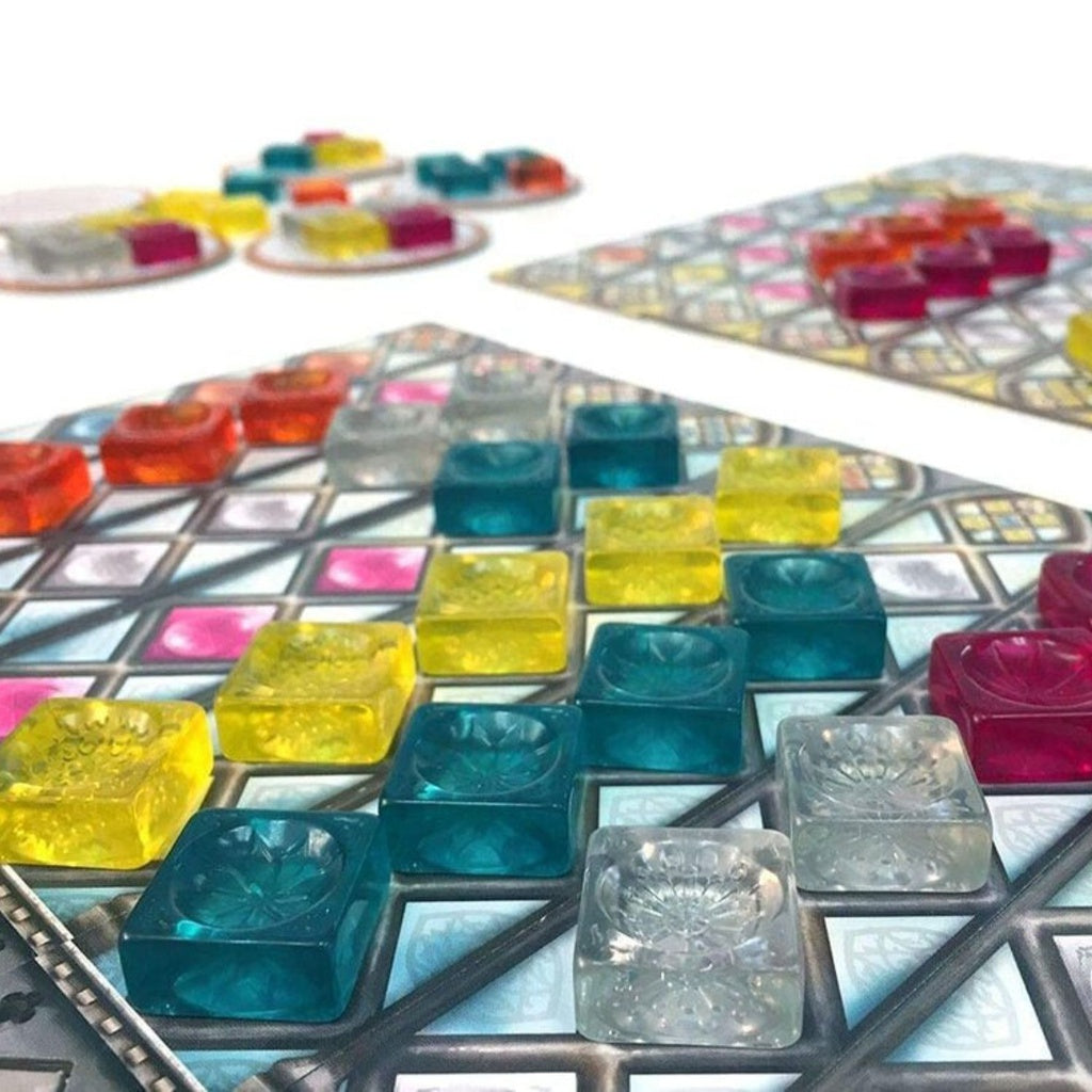 Players can expect to discover new unique art and components in Azul: Stained Glass of Sintra, including translucent window pane pieces, a tower to hold discarded glass panes, and double-sided player boards and window pane panels, in addition to many other beautiful components!