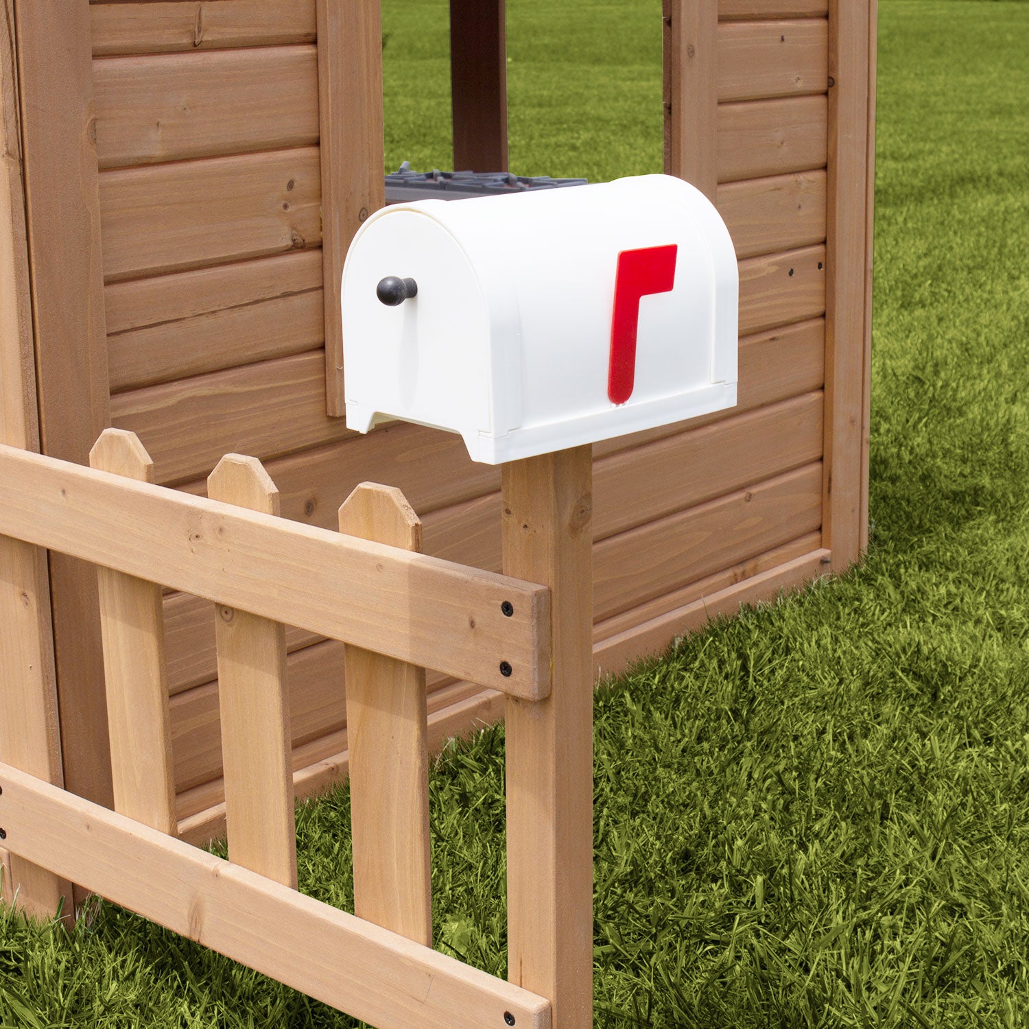 Brilliantly designed with 100% all natural cedar wood. Decorative white gable triangles, white windows, flower pot holders and a working dinner bell are all included. The outside of the playhouse encompasses a working door with an oval overhead door window.