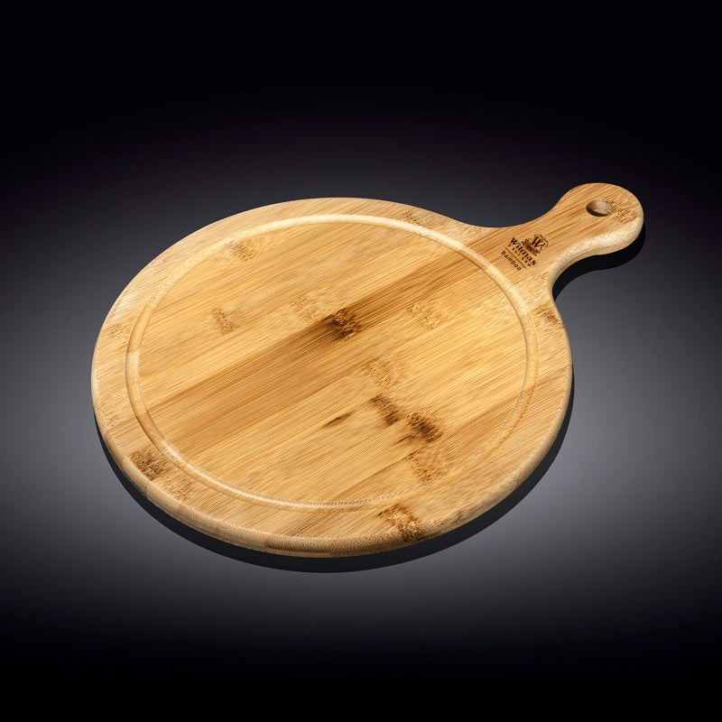 This Round Bamboo Serving Board with Handle measures 28.5 x 20.5cm including Handle. This Elegant Board is ideal for serving: - cheese, antipasto, fish, chips, pizza and is ideal for many other uses.