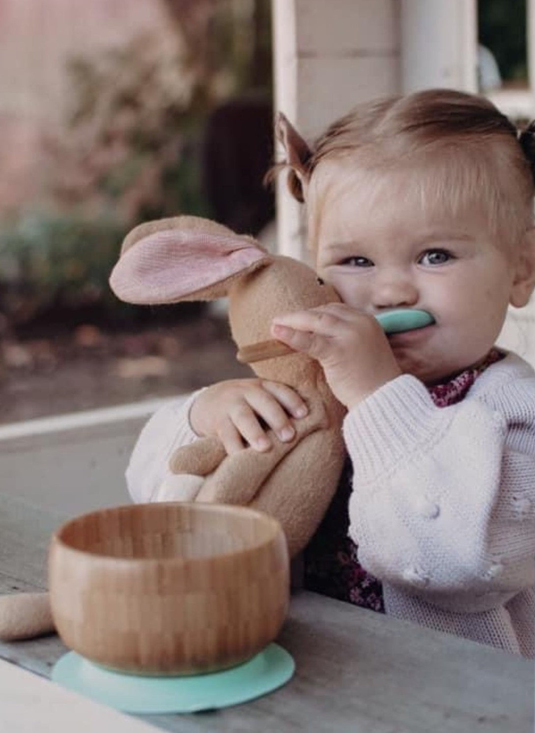 This 3 piece first dinner set for your baby is made from Moso Bamboo and features a mint silicone suction ring for a sturdy mealtime.