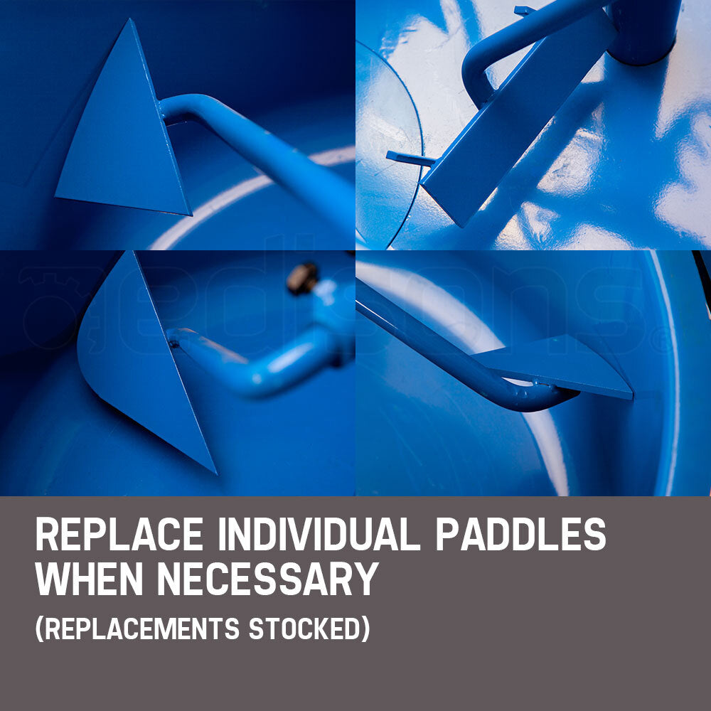 The adjustable chute and fold-down platform caters for discharge into wheelbarrows or buckets. At the end of the day the four-arm blade mixing arm can be easily removed for cleaning, and the unit can be loaded onto utes and trailers by one person.