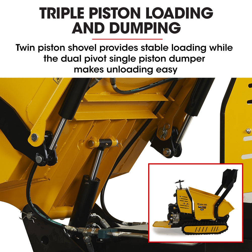 The BPR1000 is operated from the driver's platform of this powerful mini crawler. That’s one person loading and unloading safely and efficiently. By using the large hydraulic powered shovel it means loading quickly–saving time and money. This motorised track barrow turns on a dime thanks to 360° skid steering. The low centre of gravity ensures manoeuvrability and stability. The 94 mm ground clearance means you can negotiate rough worksite terrain. Just 80cm wide this powerful mini dumper is designed to easily access any site and fit into tight spaces larger, more expensive machinery can’t. It will make quick work of your bulk material moving requirements. Civil engineering, agriculture, commercial or residential landscaping this crawling mini dumper is big enough to get your job done!