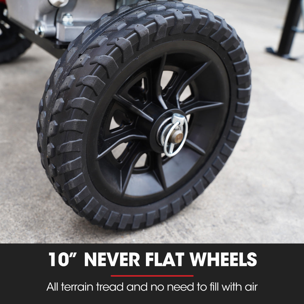 The Hercules HPS400 can be carried with the included 2” mount. It easily connects to any standard 2” vehicle receiver. Once at your destination the Hercules is easy to move into position thanks to its compact 80kg body and All Terrain 10-inch wheels, that never puncture or require filling with air.