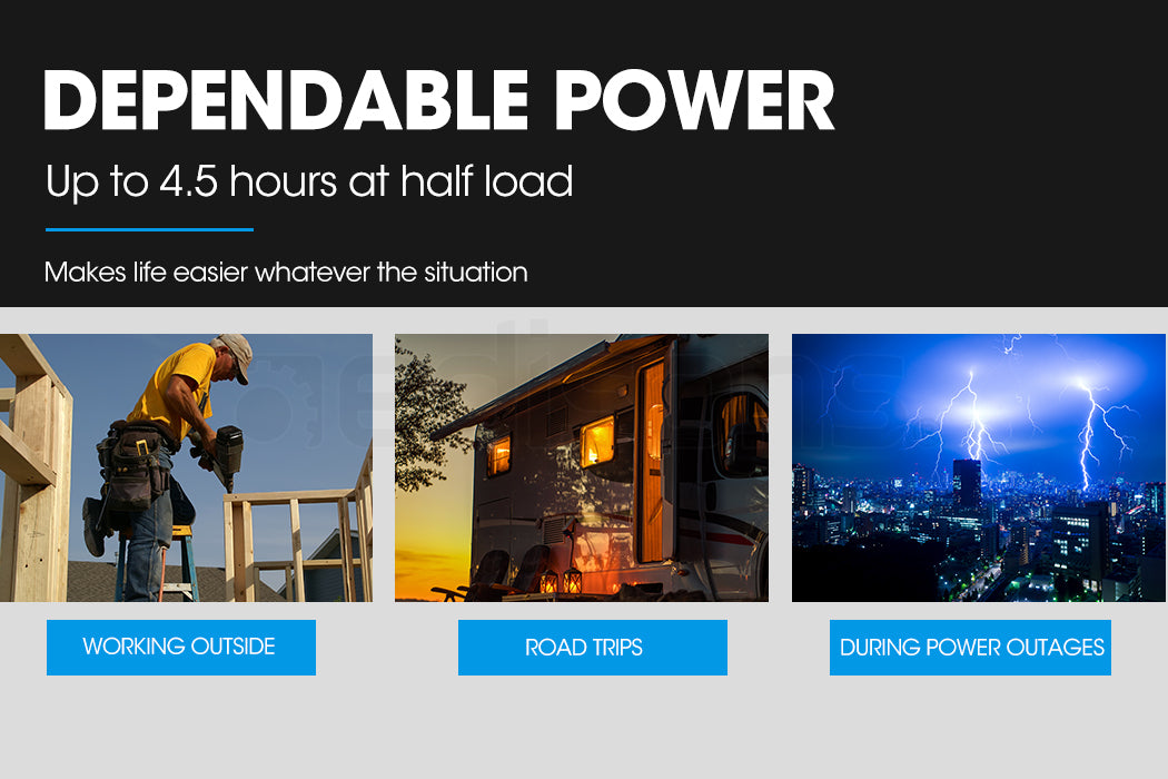 Continuous Work Time: 4.5 hr (50% load) 2.5hr (100% load)