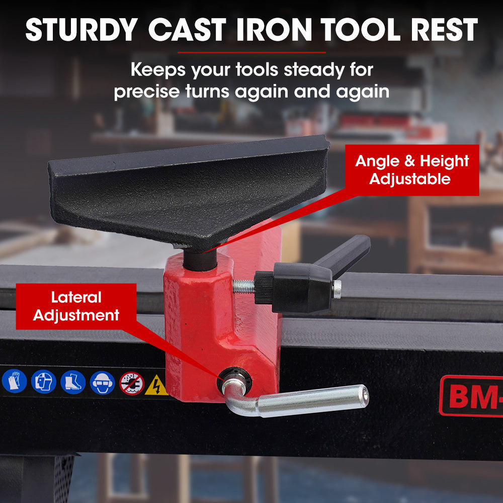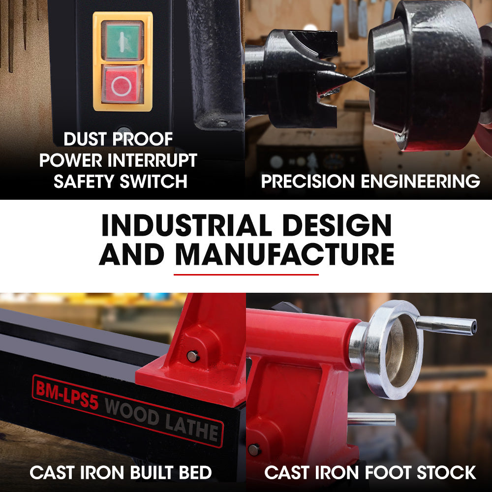 The BM-LPS5 has all the features you need to turn professional quality projects: A height, depth and angle adjustable cast iron tool rest that provides a steady tool resting point, a cast iron tapered foot stock that offers stability, multiple speeds and is bench mountable.