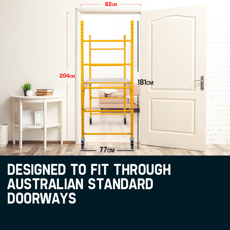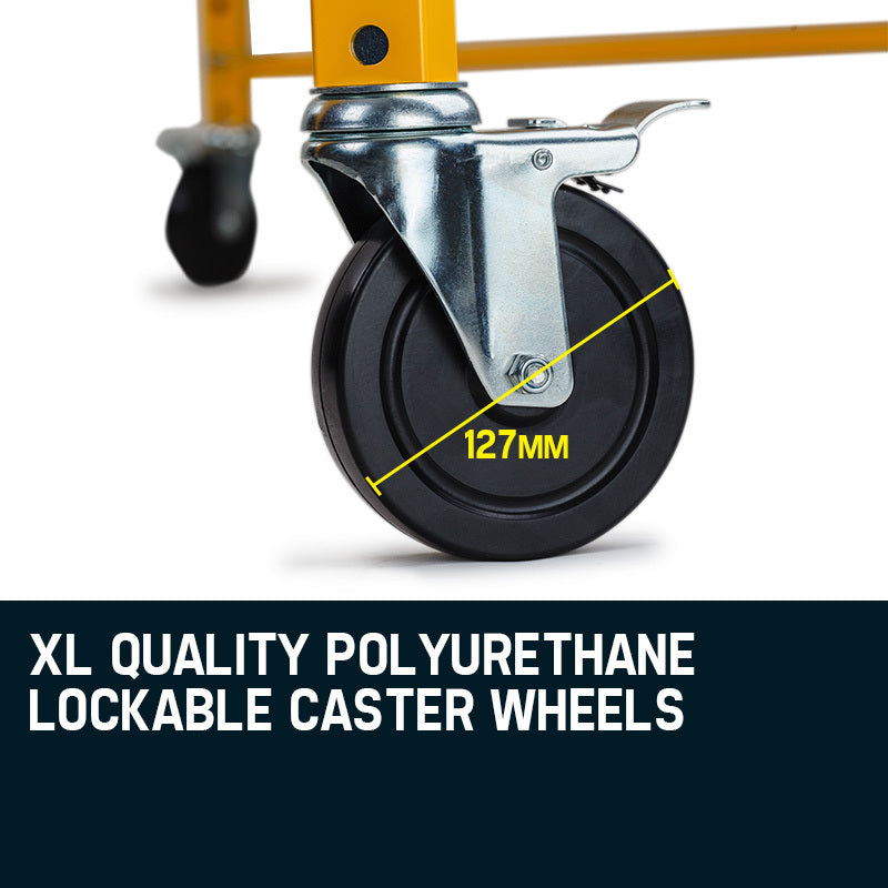 Moreover, the steel reinforced 1.45m2 wooden platform provides plenty of surface space for you and a range of your equipment, while at the same time, it's been purposely designed slim enough to fit through Australian standard doorways. It's fitted with four extra-large 127mm polyurethane lockable caster wheels that ensure optimal traction without the scuff marks. These casters are suitable for both indoor and outdoor use and lock firmly in place to secure your scaffold wherever you need it.