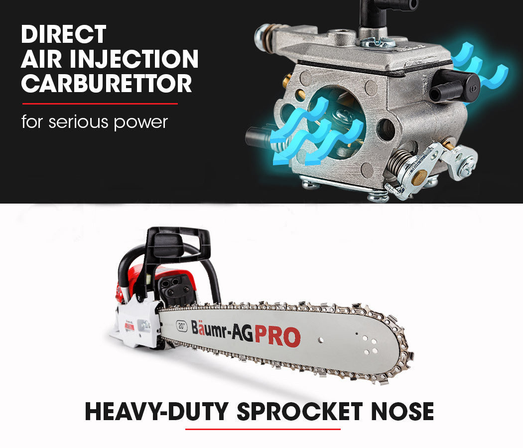 This premium range features Baumr-AG\'s patented air injection carburetor and intake system, meaning you get more grunt per CC! On-the-fly adjustments take no time at all with the on-board tool storage. And you can always keep an eye on your fuel level with the viewing window.