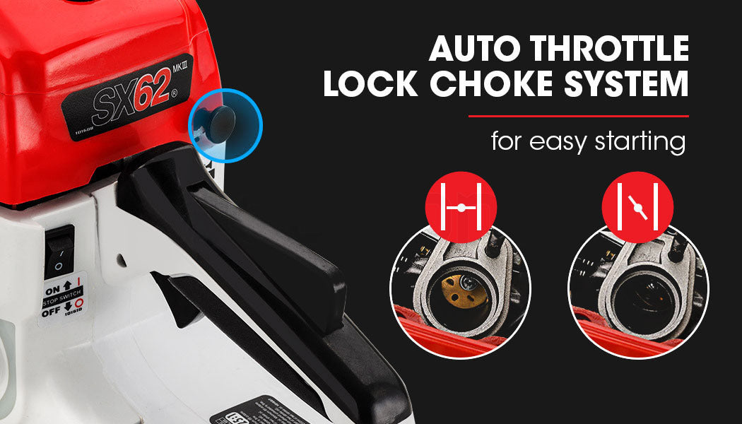 The SX62 is perfect for any application, whether it be preparing firewood, lopping medium to large trees, clearing those overhanging branches, removing bushfire hazards, or as a great companion on your next 4WD adventure or camping trip. Purchase AUSTRALIA\'s HOTTEST SELLING CHAINSAW TODAY and save hundreds off this top-of-line model.