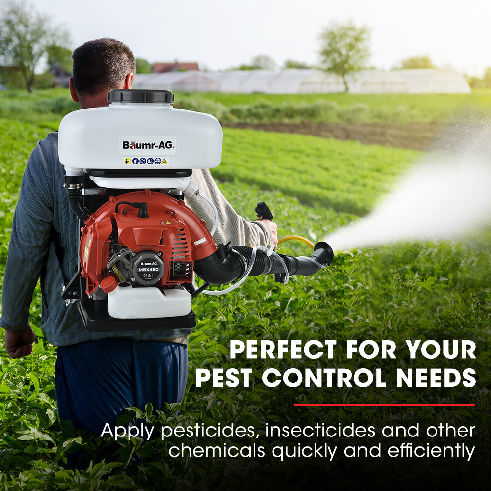 Baumr-AG continues to deliver the highest quality equipment for your agricultural needs with this new addition to the range–the MBX450 Backpack Power Sprayer. A must-have for any serious farmer or land-owner, this versatile multi-function chemical sprayer is equipped with a dependable 2-stroke engine providing the power to tackle any crop protection, pest control, livestock and premises disinfection, as well as leaf blowing needs!