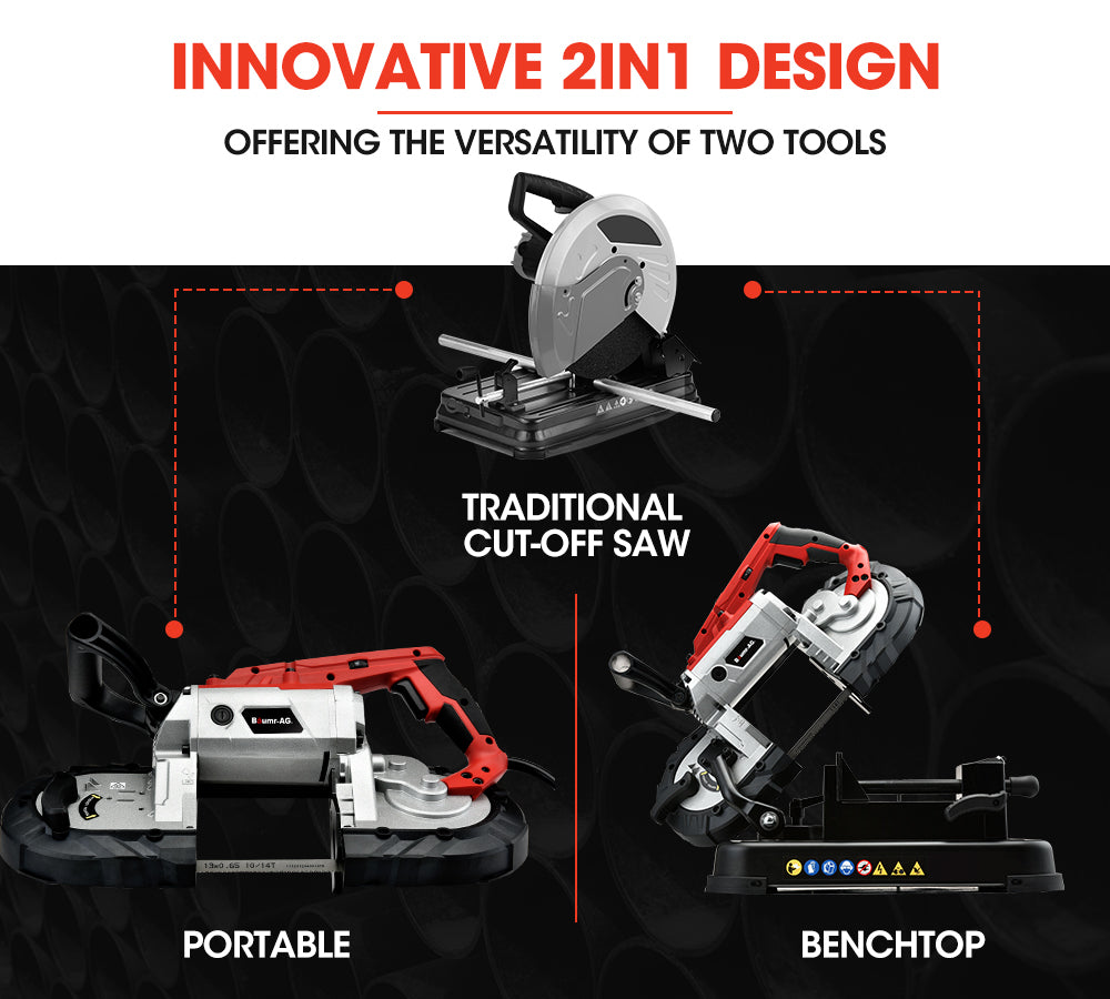 If you’re after a smart way to quickly and cleanly cut metal tube, rods, pipe, steel plate and rebar then look no further! The Baumr-AG PBS20 Cold Cut Portable Bandsaw is an innovative and powerful solution with its 2-in-1 design, 1100W Pure Copper Motor and Direct Drive gearing. It’s ready for the rigours of portable use with a tough cast aluminium body and rugged rubbed edges.