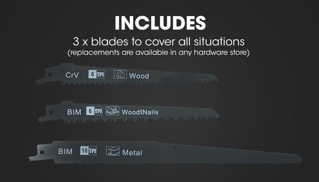 It comes with 3 blades that can be changed out in seconds using the keyless system, and replacement blades are available at any hardware store. With the RS3 Lithium Reciprocating Saw you can power through all types of aluminium, plastics, fibreglass, sheet metal while maintaining impressive cutting speeds. It even has the grunt to cut through up to 10mm of steel!