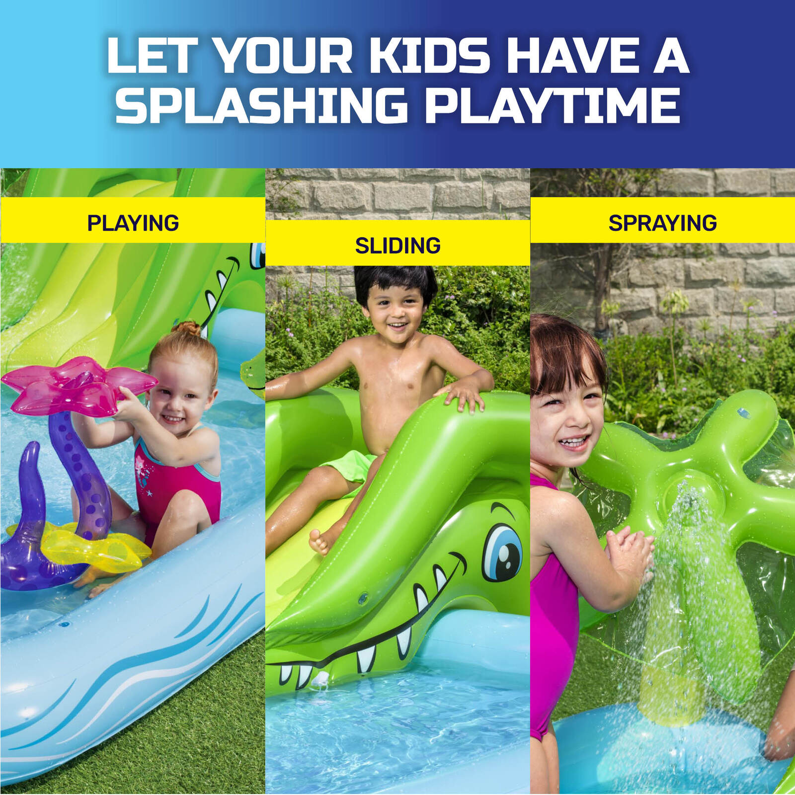 Bestway® Creating hours of fun in the summer sun is this Inflatable Aquarium Mini Water Fun Park Pool. Fitted with a cushioned pool floor, a removable slippery slide, flower water sprayer and many blow up accessories, this is sure to be a favourite activity for the kids to splash and play in.