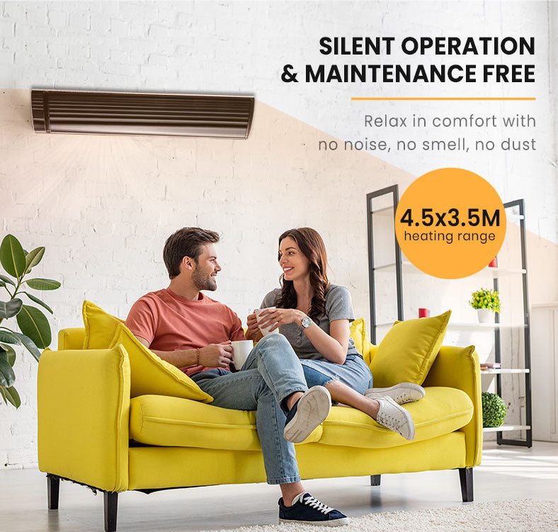 A 2400 watt electric element is embedded in the black anodised aluminium strip that rapidly produces even and gentle heat dispersion. Plus, unlike gas heaters there is no glow or glare, and no need to refuel - providing huge running costs savings.