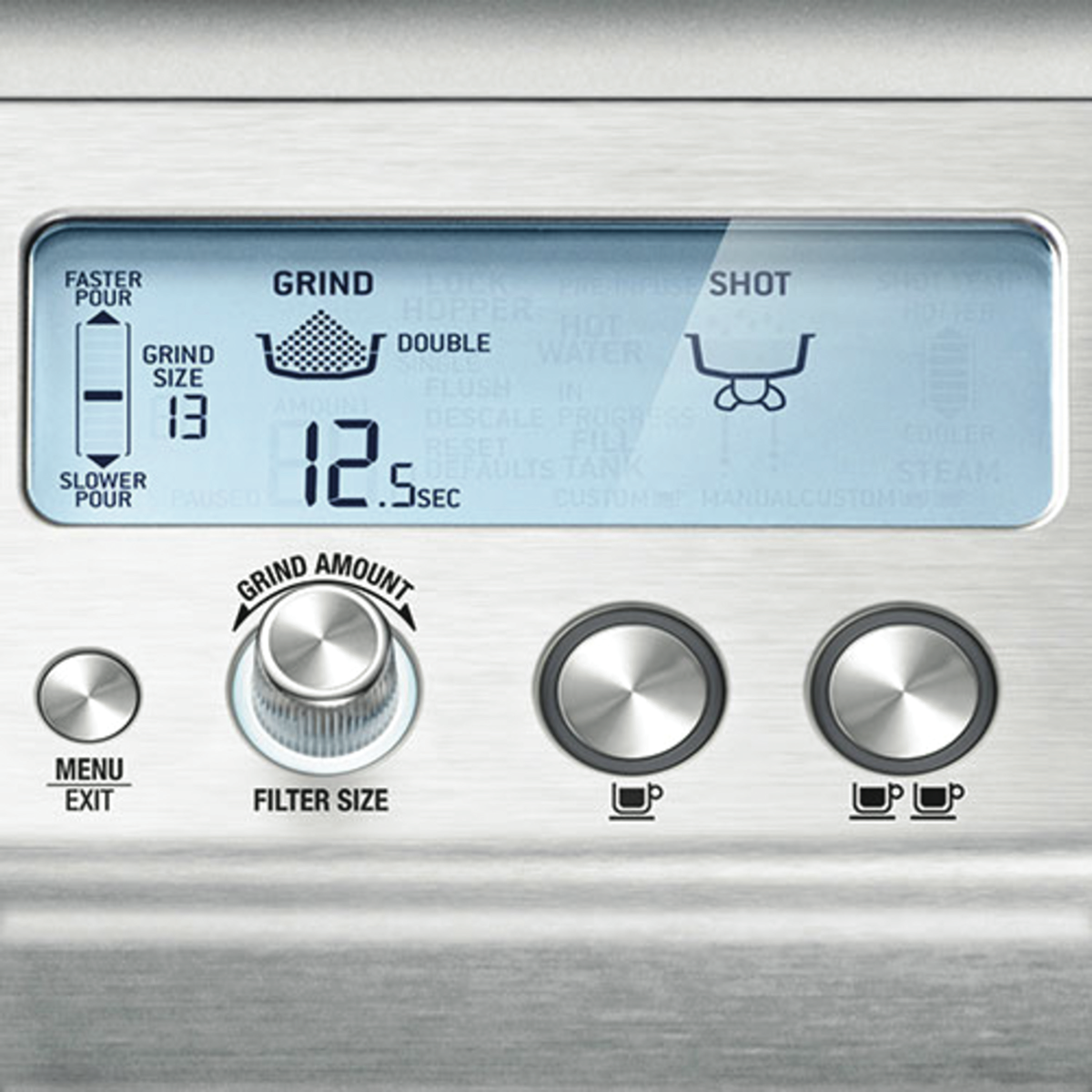 LCD Interface, 1& 2 Cup Volumetric Control, 250g Bean Hopper, Stainless Steel Conical Bur Grinder, Adjustable Grind Control, Automatic Hands-free Dosing, Instant Steam After Extraction, 54mm Stainless Steel Portafilter, Dedicated Hot Water Outlet, Integrated Removable Tamper, Removable Dip Tray |