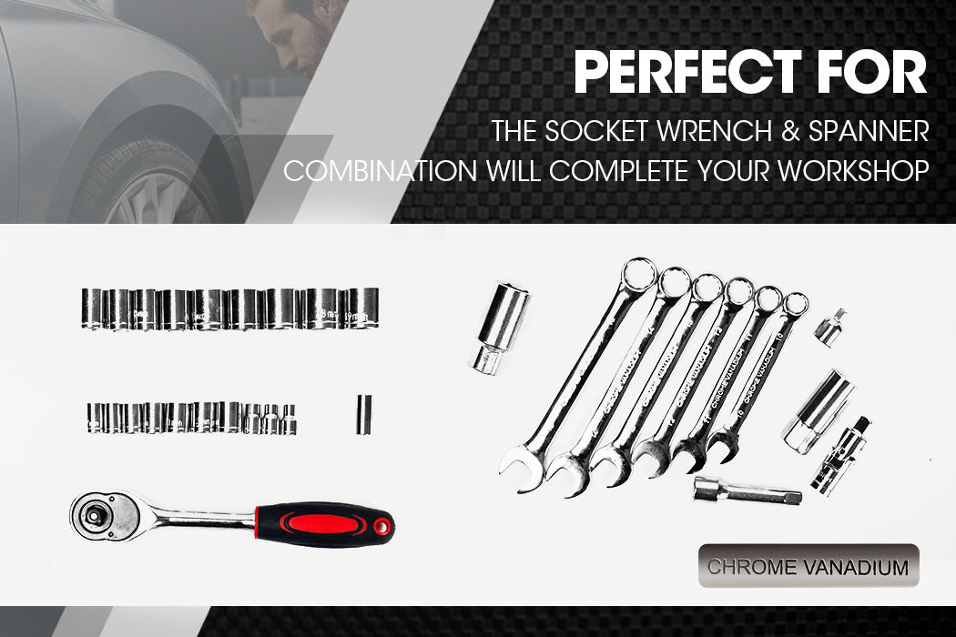 Tools: 9pcs 3/8' sockets: 10,12,13,14,15,16,17,18,19mm