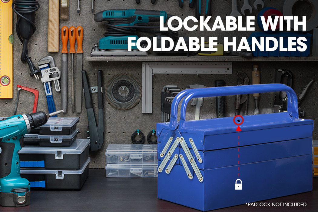 The tools are fitted within PVC moulded inserts contained in all compartments of the cantilever box. Each compartment opens out at a flat level, which makes finding and accessing each tool a cinch. The padlockable lid and foldable handles provide security and safe, compact transport. This all-inclusive compact unit contains an incredible 118 pieces and fits discreetly on a workbench or shelf.