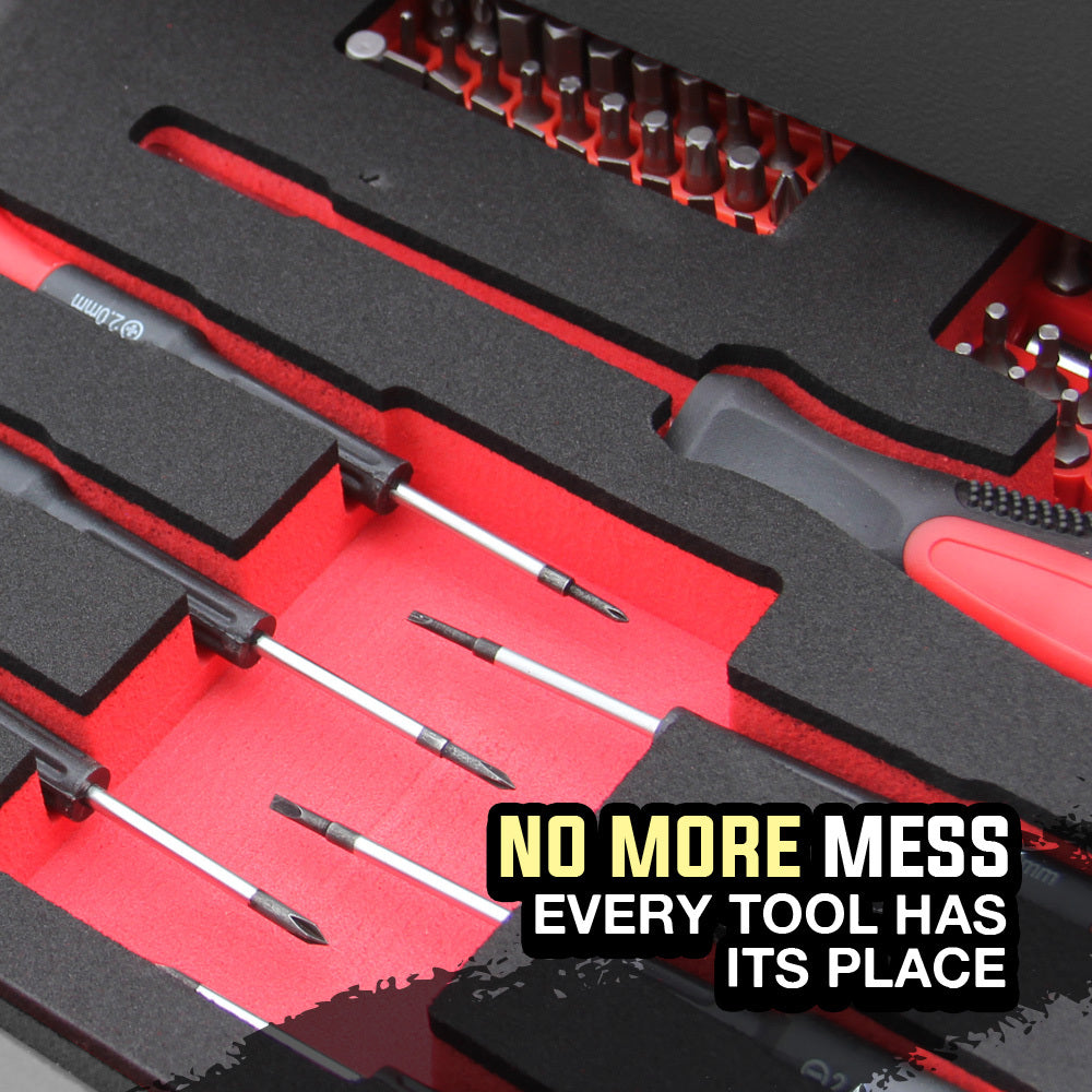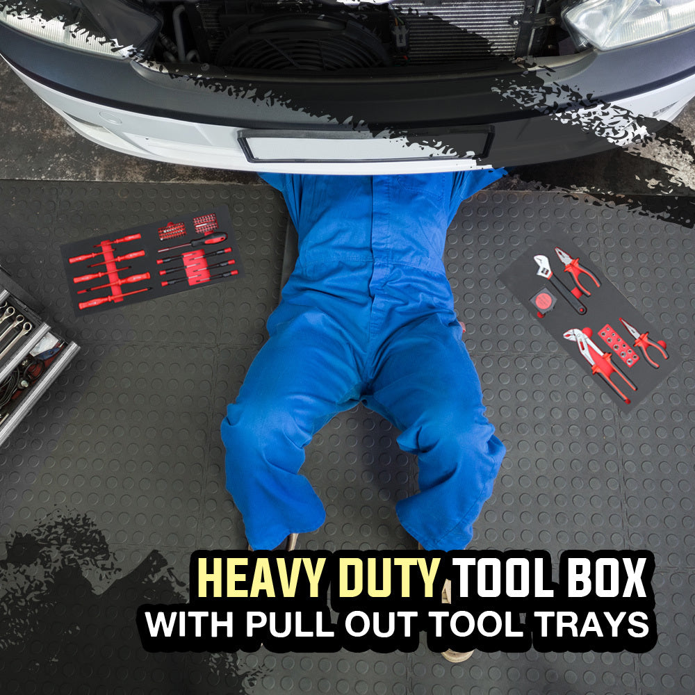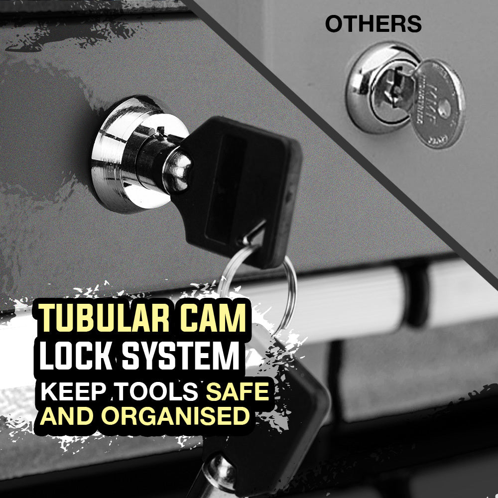 Secure removable moulded inserts contained in the four drawers ensure every tool has a place. Each drawer slides effortlessly in and out on smooth ball bearing rails, which makes finding and accessing each tool a cinch. The tubular lock provides added security and the side handles allow for easy transport. This compact unit contains an incredible 478 pieces and fits discreetly on a workbench or shelf.