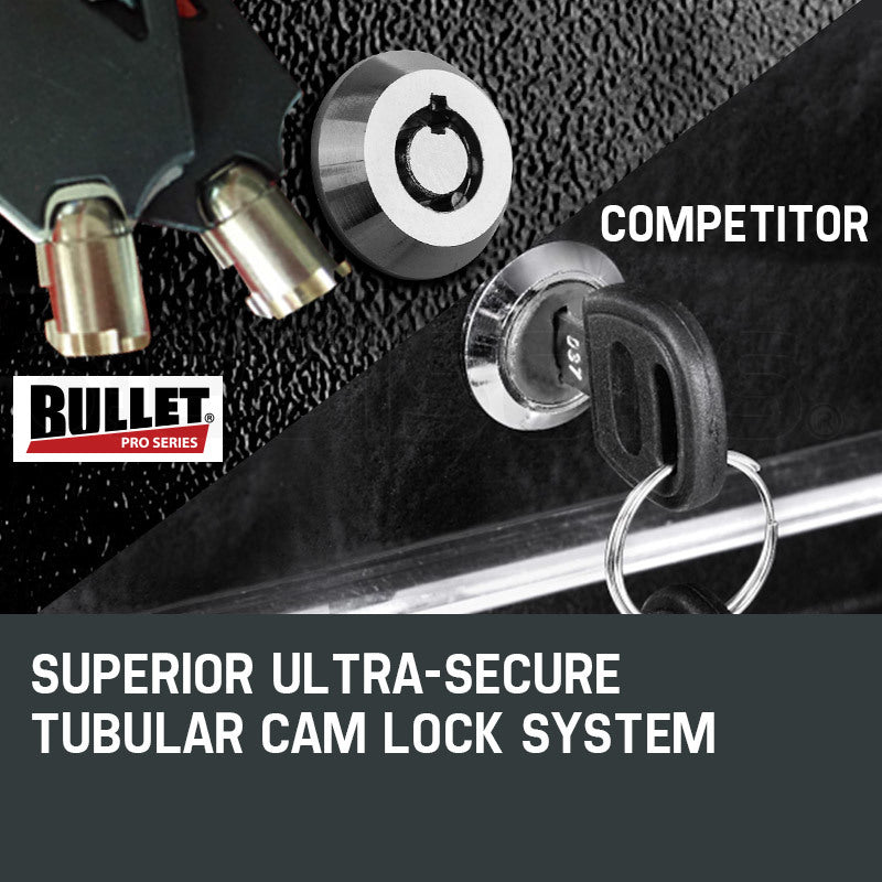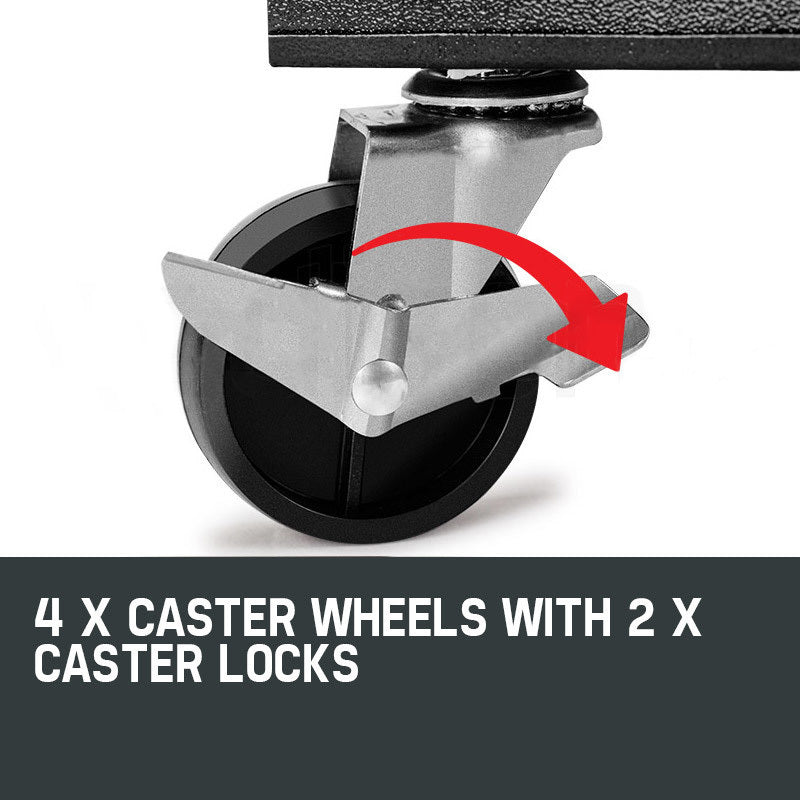 The Bullet 8 Drawer Tool Box Cabinet comes with a key lockable upper chest where valuable or often 'borrowed' items can be stored. The drawers have varying depths and sizes to accommodate all types of equipment and parts. The lower cabinet features a self-contained key lockable door that stays open and out of the way for easy access to its contents. This space is large enough to keep a range of bulkier items. The cabinet sits on top of four caster wheels with 2 x caster locks, so you have the option to secure it in one place or move it with you around a workspace. This compact double unit fits discreetly in even the smallest spaces or storage areas and features a superior tubular cam-lock system for optimal security.