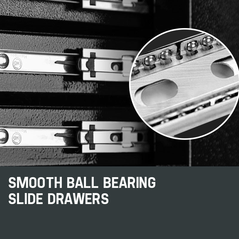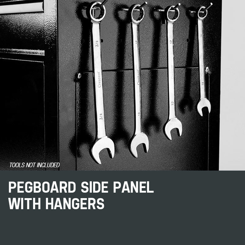 Both the cabinet and chest are built with high tensile powder coated steel enclosures. The top of the cabinet features an impact absorbent gripped surface to keep the chest secured firmly in place when mounted on top. Each drawer slides effortlessly in and out on smooth ball bearing rails, which makes finding and accessing each tool a cinch, and each drawer contains mesh grip liners to ensure your tools stay put when transporting. The cabinet also has a pegboard side panel with hangers and the chest is easily transportable thanks to its side carry handles.