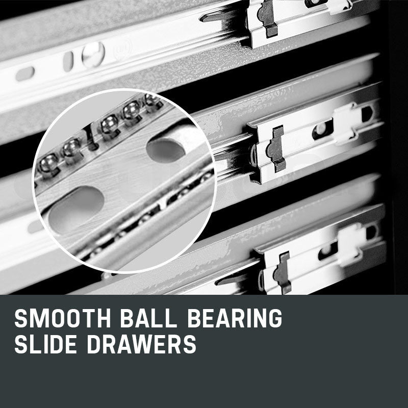 The chest is built with a high tensile powder coated steel enclosure. Each drawer slides effortlessly in and out on smooth ball bearing rails, which makes finding and accessing each tool a cinch, and each drawer contains mesh grip liners to ensure your tools stay put when transporting. The unit is easily transportable, thanks to its side carry handles.