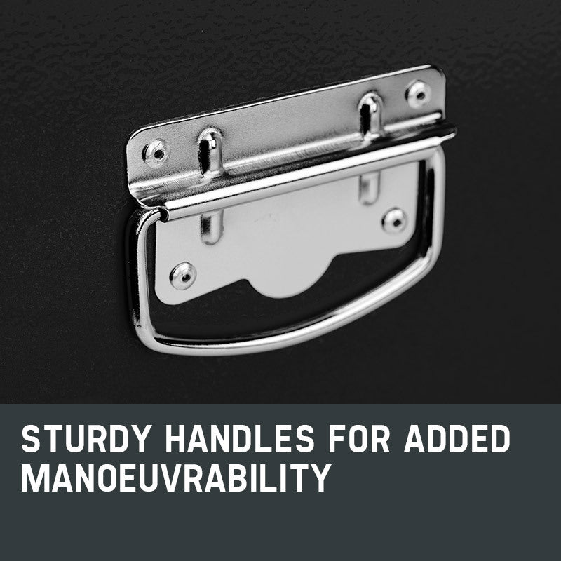 The chest is built with a high tensile powder coated steel enclosure. Each drawer slides effortlessly in and out on smooth ball bearing rails, which makes finding and accessing each tool a cinch, and each drawer contains mesh grip liners to ensure your tools stay put when transporting. The unit is easily transportable, thanks to its side carry handles.