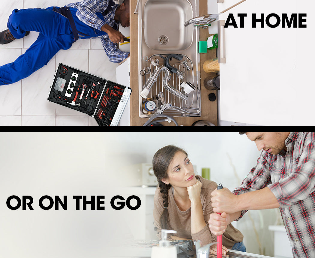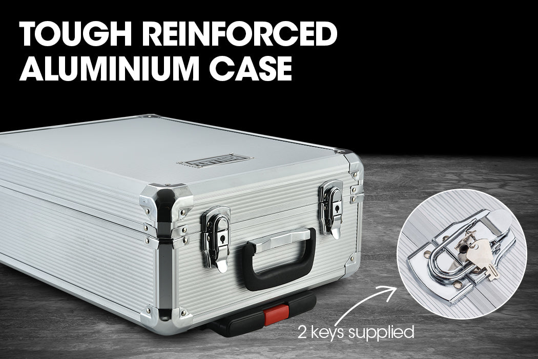 The tools are fitted in four secure removable blow moulded inserts layered within the case. Both its carry handle and telescopic handle coupled with the roller wheels allow for effortless transporting. Dual lock and key latches secure the case, with two keys included. This all-inclusive compact unit contains an incredible 925 pieces and fits discreetly in any room of the house.