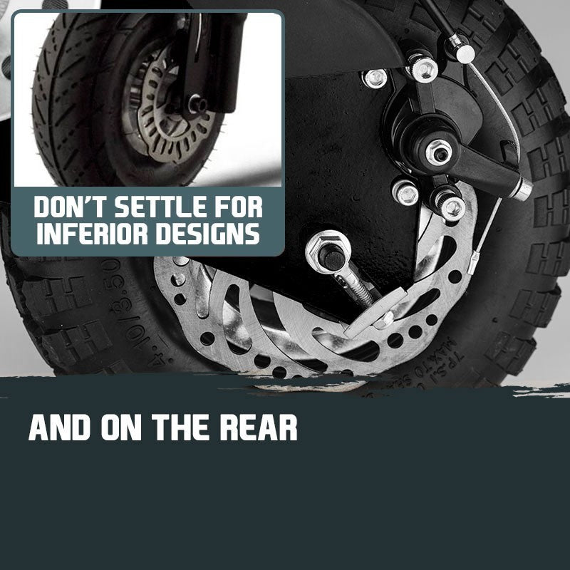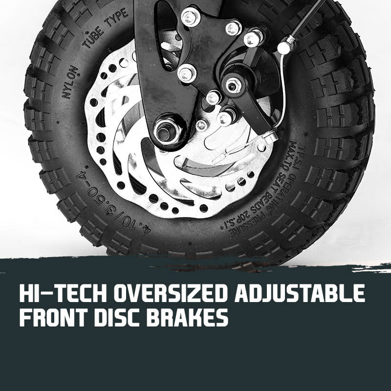 Of course, our boffins paid equal attention to the handling - a high-tensile yet lightweight steel frame houses tough polished steel shocks, massive disc brakes and oversized knobby 10-inch tyres. For those that like to tinker with their toys, you'll love how easy it is to tweak the shocks and brakes to your riding style.
