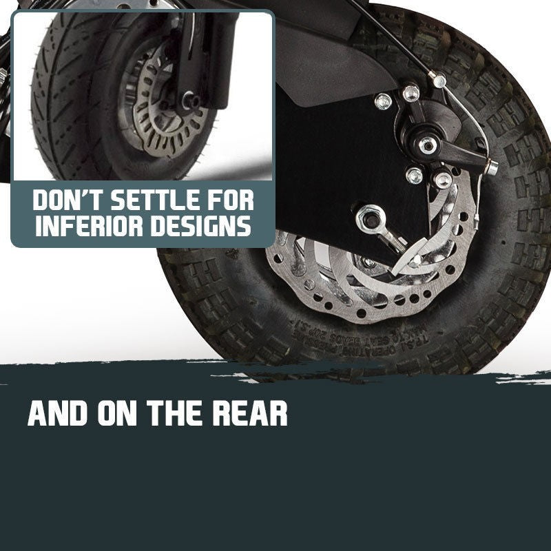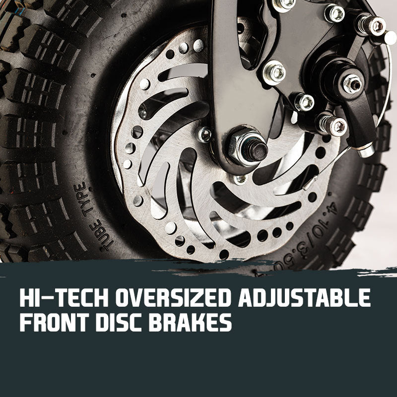 Of course, our boffins paid equal attention to the handling - high-tensile yet lightweight steel frame houses tough polished steel shocks, massive disc brakes and oversized knobby 10-inch tyres. For those that like to tinker with their toys, you'll love how easy it is to tweak the shocks and brakes to your riding style.